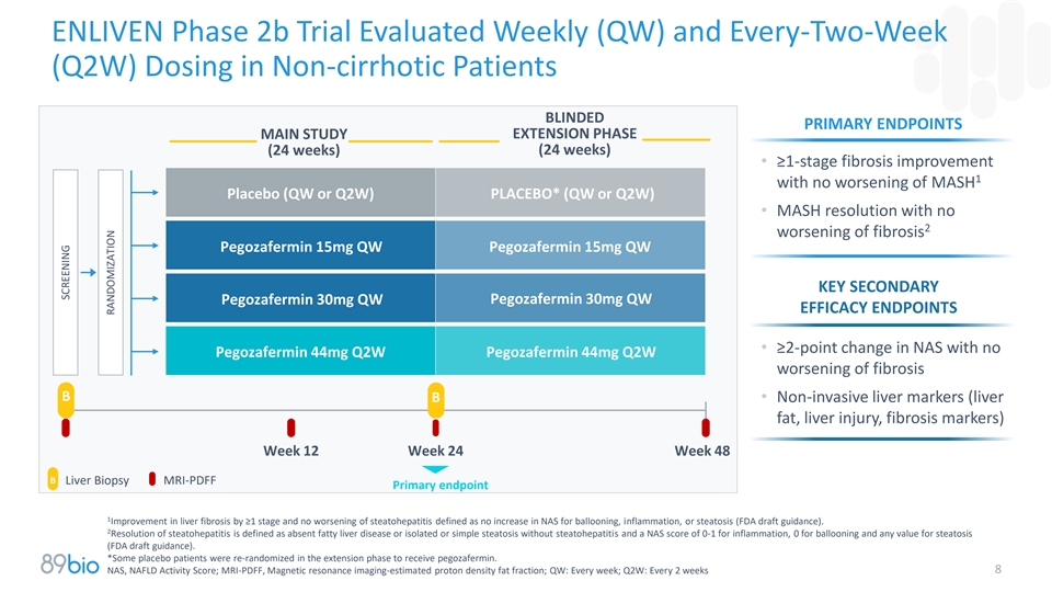 ENLIVEN 2b期试验在非肝硬化失明患者中评估每周(QW)和每两周(Q2W)给药主要研究延长阶段(24周)(24周)• ≥ 1期纤维化改善1无MASH安慰剂恶化(QW或Q2W)PLACEB PLO*ACEBO(QWQ2 ORW Q2W)• mASH分辨率伴无2纤维化恶化pegozafermin 15mg QW pegozafermin 15mg QW关键次要pegozafermin 30mg QW pegozafermin 30mg QW Efficacy endpoints • NAS ≥ 2点变化伴无pegozafermin 44mg Q2W pegozafermin 44mg Q2W纤维化恶化B B •非侵入性肝脏标志物(肝脂肪、肝损伤、纤维化标志物)第12周第24周第48周B肝活检MRI-PDFF主要终点1肝纤维化改善≥ 1阶段且脂肪性肝炎无恶化定义为球囊、炎症或脂肪变性的NAS无增加(FDA指导草案)。2脂肪性肝炎的消退定义为无脂肪性肝病或无脂肪性肝炎的孤立或单纯性脂肪变性,且炎症的NAS评分为0-1,球囊肿0,脂肪变性的任何值(FDA指导草案)。*部分安慰剂患者在延长阶段重新随机分配接受pegozafermin。8NAS,NAFLD活性评分;MRI-PDFF,磁共振成像-估算质子密度脂肪分数;QW:每周一次;Q2W:每2周一次筛查随机