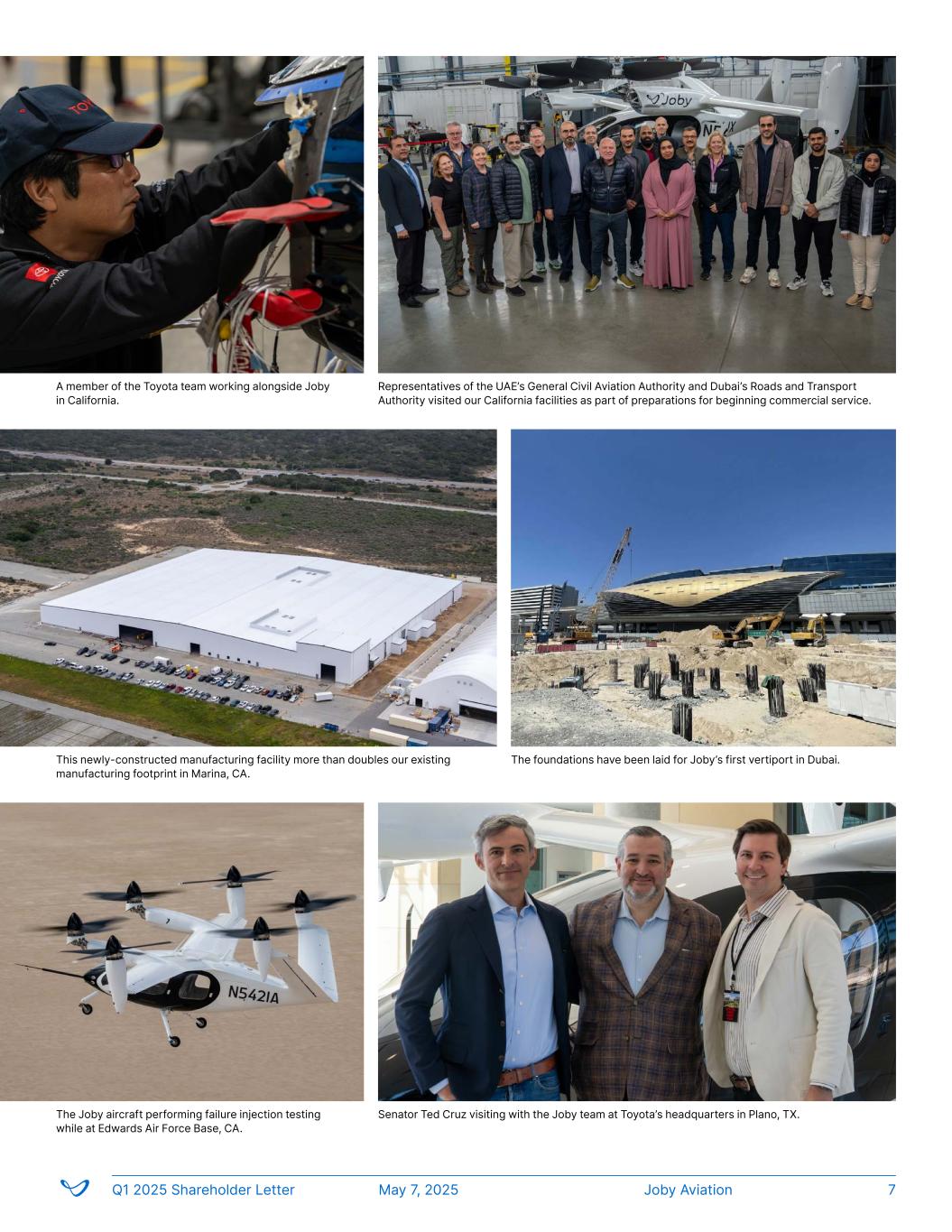 阿联酋通用民航局和迪拜道路和交通管理局的代表参观了我们在加州的设施,作为开始商业服务的准备工作的一部分。与Joby一起在加利福尼亚州工作的丰田团队成员。这个新建的制造工厂使我们在加利福尼亚州 Marina的现有制造足迹增加了一倍以上。这架Joby飞机在加利福尼亚州爱德华兹空军基地进行失效注射测试。参议员特德·克鲁兹(Ted Cruz)与乔比(Joby)团队在丰田位于德克萨斯州普莱诺的总部进行访问。这些基础已经为Joby在迪拜的首个垂直机场奠定。Joby Aviation 2025年第一季度股东函2025年5月7日7