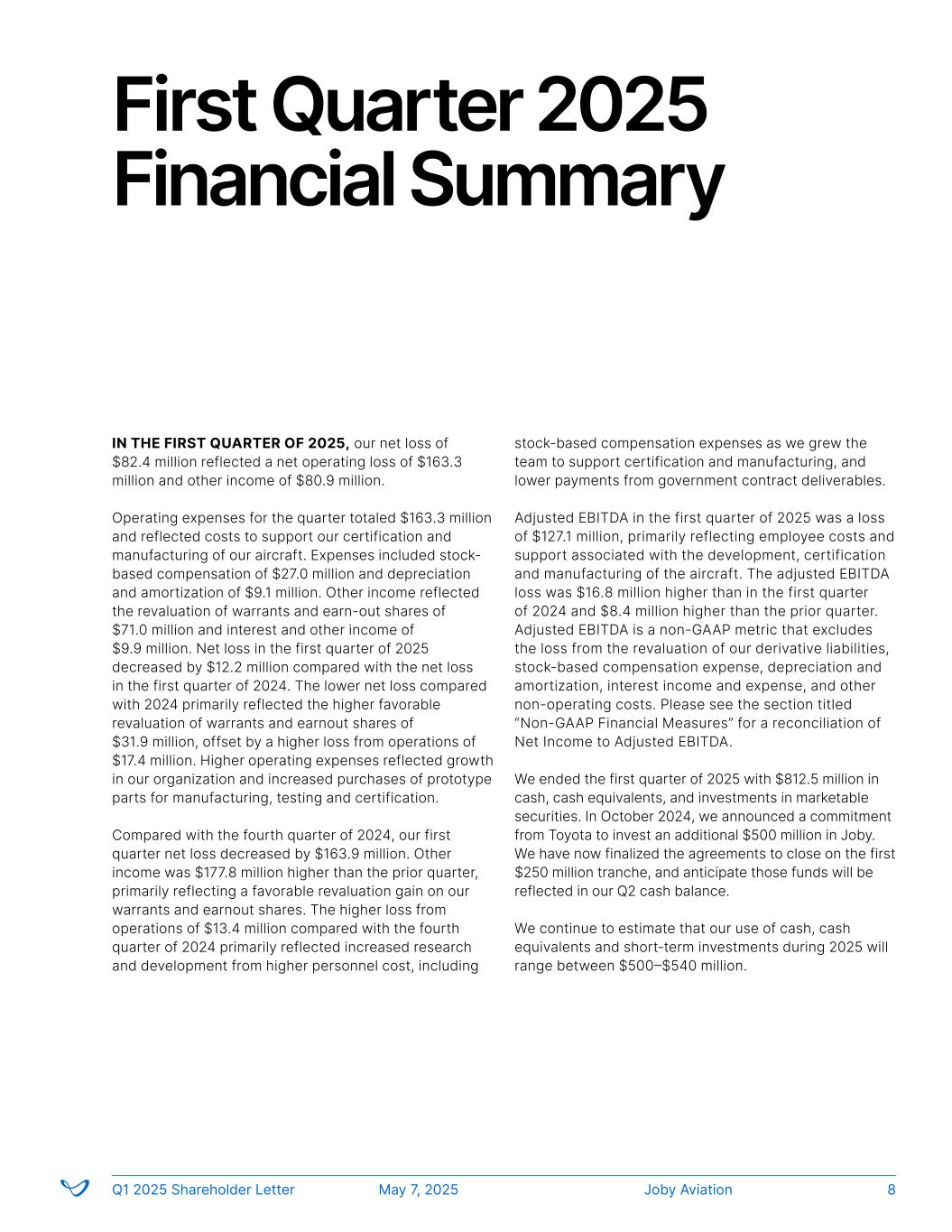 2025年第一季度财务摘要在2025年第一季度,我们的净亏损8240万美元反映了1.633亿美元的净运营亏损和8090万美元的其他收入。本季度的运营费用总计1.633亿美元,反映了支持我们的飞机认证和制造的成本。支出包括2700万美元的股票薪酬以及910万美元的折旧和摊销。其他收入反映认股权证和盈利股票重估7100万美元以及利息和其他收入990万美元。与2024年第一季度的净亏损相比,2025年第一季度的净亏损减少了1220万美元。与2024年相比,净亏损减少主要反映了认股权证和盈利股票的有利重估3190万美元,但被较高的运营亏损1740万美元所抵消。较高的运营费用反映了我们组织的增长以及制造、测试和认证的原型零件采购增加。与2024年第四季度相比,我们第一季度的净亏损减少了1.639亿美元。其他收入比上一季度高出1.778亿美元,主要反映了我们的认股权证和盈利股票的有利重估收益。与2024年第四季度相比,运营亏损增加了1340万美元,这主要反映了人员成本增加导致的研发增加,包括随着我们扩大团队以支持认证和制造而产生的基于股票的补偿费用,以及政府合同交付物支付的减少。2025年第一季度调整后EBITDA亏损1.271亿美元,主要反映了与飞机开发、认证和制造相关的员工成本和支持。调整后的EBITDA亏损比2024年第一季度高出1680万美元,比上一季度高出840万美元。调整后的EBITDA是一种非GAAP指标,不包括我们的衍生负债、基于股票的补偿费用、折旧和摊销、利息收入和费用以及其他非运营成本的重估损失。关于净收入与调整后EBITDA的对账,请参阅标题为“非GAAP财务指标”的部分。截至2025年第一季度,我们拥有8.125亿美元的现金、现金等价物和有价证券投资。2024年10月,我们宣布丰田承诺向Joby追加投资5亿美元。我们现在已经敲定了完成第一笔2.5亿美元贷款的协议,并预计这些资金将反映在我们第二季度的现金余额中。我们继续估计,我们在2025年期间对现金、现金等价物和短期投资的使用将介于500 – 5.4亿美元之间。Joby Aviation 2025年第一季度股东信2025年5月7日8
