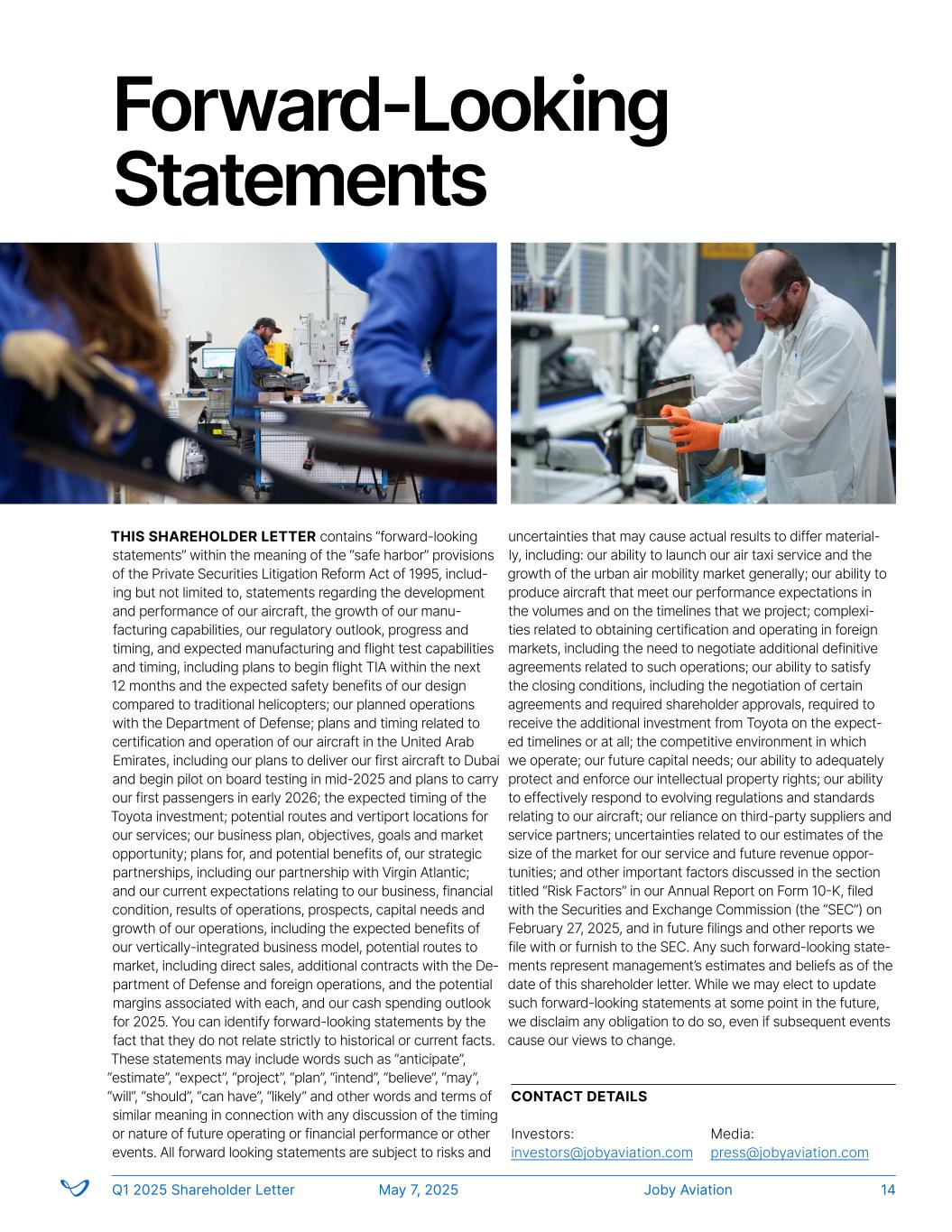 前瞻性陈述这封股东信函包含1995年《私人证券诉讼改革法案》“安全港”条款含义内的“前瞻性陈述”,包括但不限于关于我们飞机的发展和性能、我们的制造能力增长、我们的监管前景、进展和时机、以及预期的制造和飞行测试能力和时机的陈述,包括计划在未来12个月内开始飞行TIA,以及与传统直升机相比,我们设计的预期安全收益;我们与国防部的计划操作;与我们的飞机在阿拉伯联合酋长国的认证和运营相关的计划和时间安排,包括我们计划在2025年年中向迪拜交付我们的第一架飞机并开始机载测试,并计划在2026年初搭载我们的第一批乘客;丰田投资的预期时间安排;我们服务的潜在路线和垂直机场位置;我们的业务计划、目标,目标和市场机会;我们的战略合作伙伴关系的计划和潜在利益,包括我们与维珍航空的合作伙伴关系;以及我们目前对我们的业务、财务状况、运营结果、前景、资本需求和运营增长的预期,包括我们垂直整合的商业模式的预期利益、潜在的市场路线,包括直接销售、与国防部和外国业务部门的额外合同,以及与每一项相关的潜在利润率,以及我们对2025年的现金支出前景。您可以通过与历史或当前事实不严格相关这一事实来识别前瞻性陈述。这些陈述可能包括“预期”、“估计”、“预期”、“项目”、“计划”、“打算”、“相信”、“可能”、“将”、“应该”、“可以拥有”、“可能”等与任何有关未来经营或财务业绩或其他事件的时间或性质的讨论具有类似含义的词语和术语。所有前瞻性陈述都受到可能导致实际结果出现重大差异的风险和不确定性的影响,包括:我们推出空中出租车服务的能力和城市空中交通市场的总体增长;我们生产在数量上和我们预测的时间表上符合我们业绩预期的飞机的能力;与获得认证和在国外市场运营相关的复杂关系,包括需要就与此类运营相关的额外最终协议进行谈判;我们满足成交条件的能力,包括某些协议的谈判和所需的股东批准,被要求在预期的时间线上或根本不接受丰田的额外投资;我们经营所处的竞争环境;我们未来的资本需求;我们充分保护和执行我们的知识产权的能力;我们有效应对与我们的飞机相关的不断变化的法规和标准的能力;我们对第三方供应商和服务合作伙伴的依赖;与我们对我们的服务的市场规模和未来收入机会的估计相关的不确定性;以及我们的10-K表格年度报告中标题为“风险因素”一节中讨论的其他重要因素,于2025年2月27日向美国证券交易委员会(“SEC”)提交的文件,以及在我们向SEC提交或提供的未来文件和其他报告中。任何此类前瞻性陈述均代表管理层截至本股东信函之日的估计和信念。虽然我们可能会选择在未来某个时候更新此类前瞻性陈述,但我们不承担这样做的任何义务,即使后续事件导致我们的观点发生变化。联系人详情投资者:investors@jobyaviation.com媒体:press@jobyaviation.com Joby AviationQ1 2025股东信2025年5月7日14