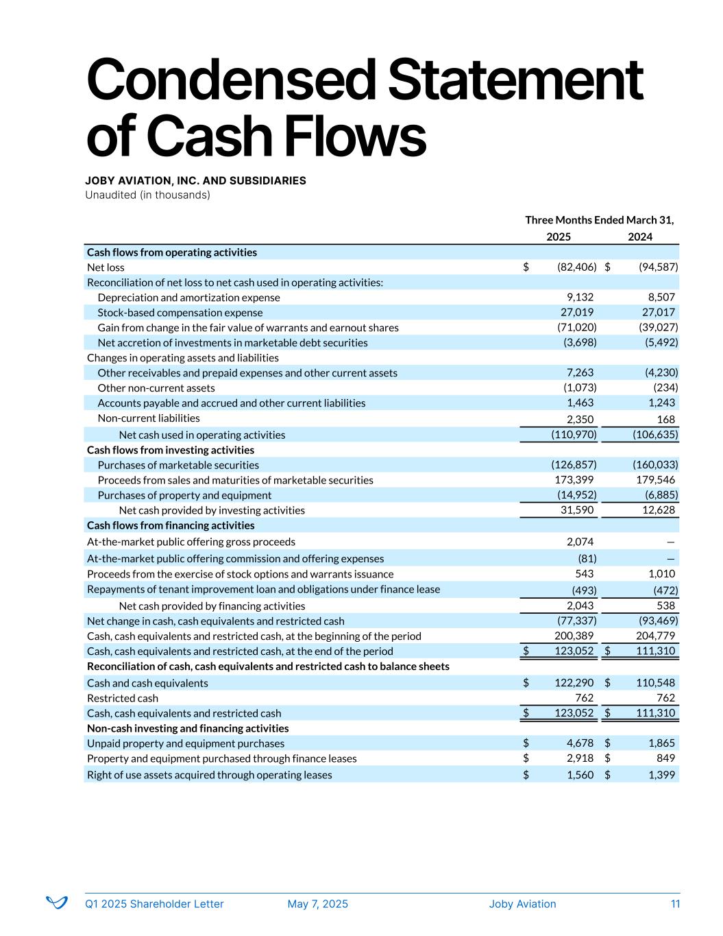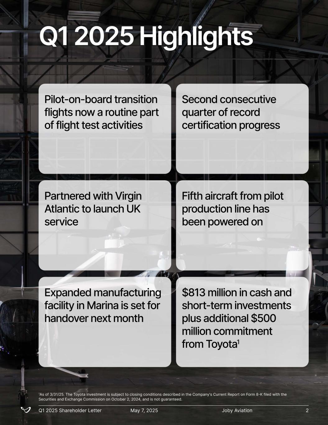 飞行员-机载过渡飞行现在是飞行测试活动的例行部分,与维珍航空合作推出英国服务位于马里纳的扩建制造工厂将于下个月移交,连续第二个季度取得创纪录的认证进展。截至3/31/25,来自飞行员生产线的第五架飞机已获得8.13亿美元现金和短期投资以及Toyota1 1额外5亿美元的承诺。丰田投资受制于公司于2024年10月2日向美国证券交易委员会提交的关于表格8-K的当前报告中所述的成交条件,并且不受保证。2025年第一季度亮点Joby Aviation 2025年第一季度股东信函2025年5月7日2