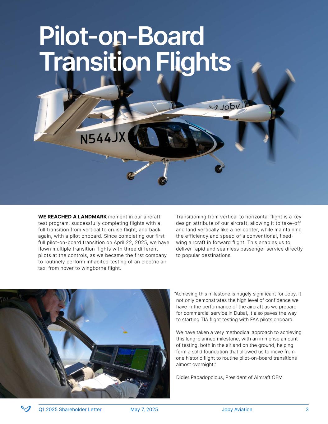 我们在飞机测试计划中达到了一个里程碑式的时刻,成功完成了从垂直飞行到巡航飞行的全面过渡飞行,并再次返回,搭载了一名飞行员。自2025年4月22日完成我们的第一次完整的机载飞行员过渡以来,我们已经与三名不同的飞行员在控制下进行了多次过渡飞行,因为我们成为第一家对电动空中出租车从悬停到翼载飞行进行例行有人居住测试的公司。从垂直飞行过渡到水平飞行是我国飞机的一个关键设计属性,使其能够像直升机一样垂直起降,同时保持常规固定翼飞机向前飞行的效率和速度。这使我们能够直接向热门目的地提供快速、无缝的客运服务。“实现这一里程碑对Joby来说意义重大。它不仅表明了我们在迪拜为商业服务做准备时对飞机性能的高度信心,还为开始与FAA飞行员一起进行TIA飞行测试铺平了道路。为了实现这一计划已久的里程碑,我们采取了非常有条不紊的方法,在空中和地面进行了大量测试,帮助形成了坚实的基础,使我们几乎可以在一夜之间从一次历史性飞行过渡到例行的机载飞行员过渡。”Didier Papadopolous,Aircraft OEM Pilot-on-Board Transition Flights总裁Joby AviationQ1 2025股东信2025年5月7日3