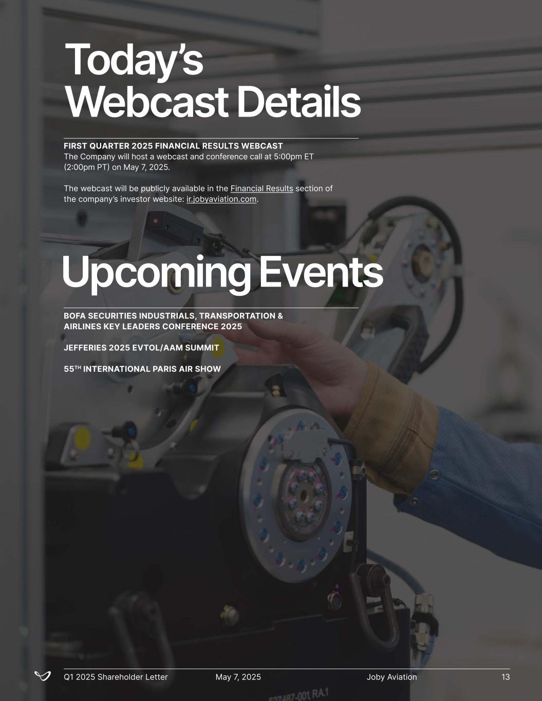 即将举行的活动今天的网络直播详细介绍2025年第一季度财务业绩网络广播公司将于美国东部时间2025年5月7日下午5:00(太平洋时间下午2:00)举办网络直播和电话会议。该网络直播将在该公司投资者网站的财务业绩部分公开提供:ir.jobyaviation.com。BOFA SECURITIES INDUSTRIES,Transportation & Airlines Key Leaders Conference 2025 JEFFERIES 2025 EVTOL/AAM Summit第55届国际巴黎航空展Joby Aviation Q1 2025股东信2025年5月7日13