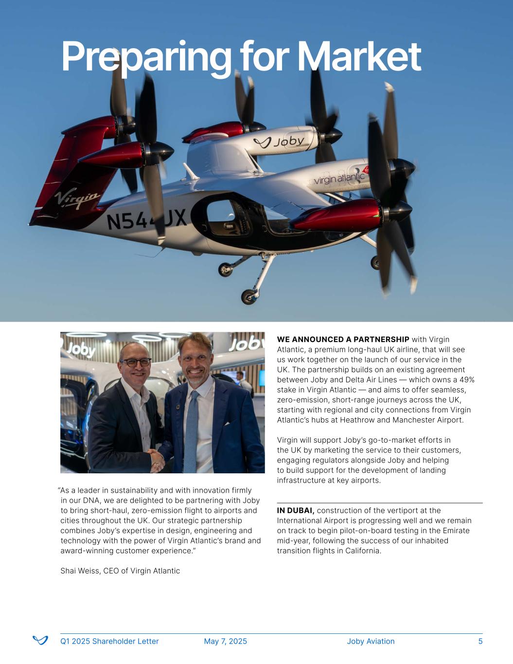 为市场做准备我们宣布与英国优质长途航空公司维珍航空建立合作伙伴关系,这将使我们共同努力在英国推出我们的服务。该合作伙伴关系建立在Joby与达美航空(拥有维珍航空49%的股份)之间现有协议的基础上,旨在提供英国全境的无缝、零排放、短程旅程,首先是从维珍航空的枢纽希思罗机场和曼彻斯特机场的区域和城市连接。维珍将支持Joby在英国的上市努力,向客户推销该服务,与Joby一起与监管机构接触,并帮助建立对主要机场着陆基础设施发展的支持。在迪拜,国际机场的垂直机场建设进展顺利,继我们在加利福尼亚州的有人居住的过渡航班取得成功之后,我们仍有望在年中开始在阿联酋进行机载飞行员测试。“作为可持续发展领域的领导者,我们的DNA中有着坚定的创新,我们很高兴能与Joby合作,为英国各地的机场和城市带来短途、零排放的航班。我们的战略合作伙伴关系将Joby在设计、工程和技术方面的专业知识与维珍航空的品牌力量和屡获殊荣的客户体验相结合。”维珍航空Joby Aviation首席执行官Shai Weiss 2025年第一季度股东信2025年5月7日5