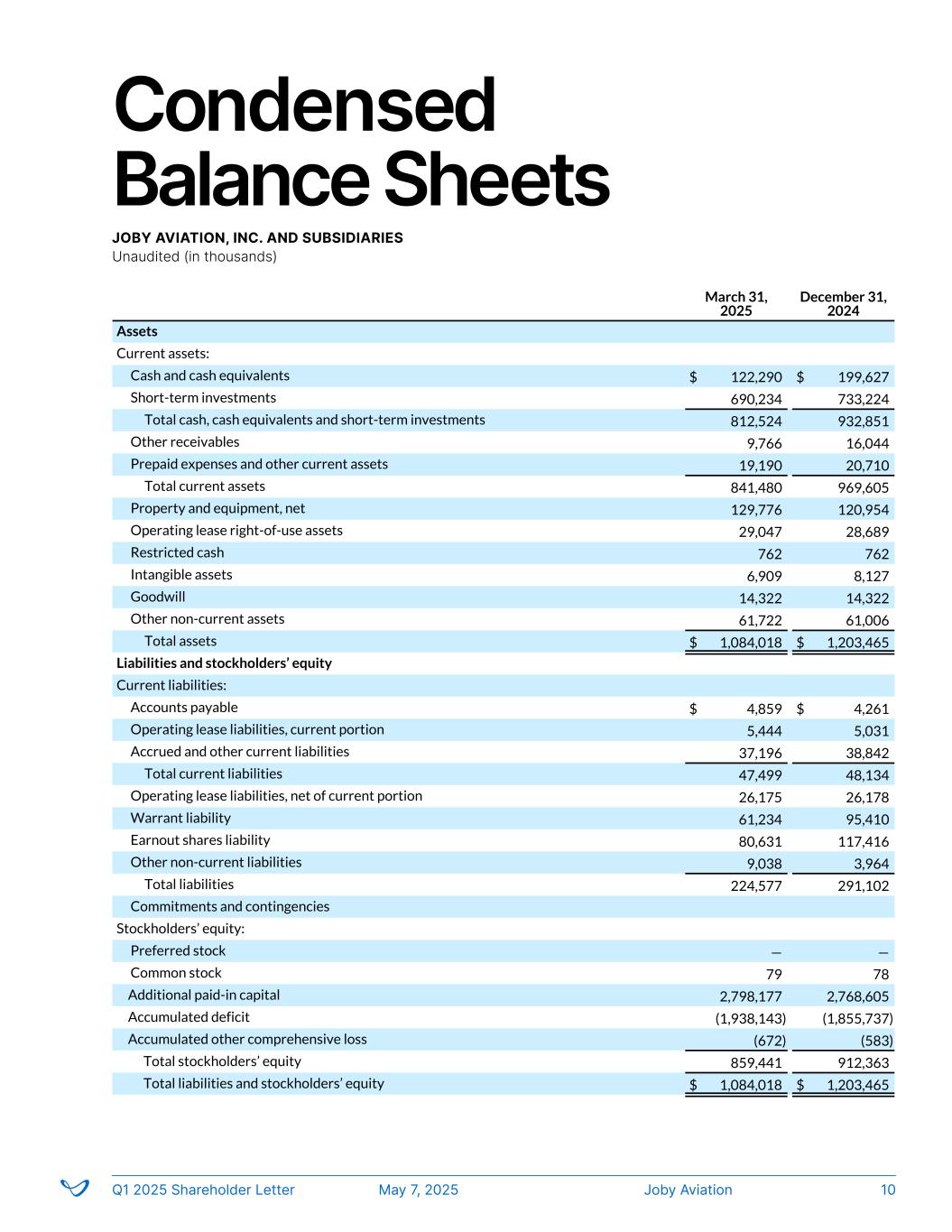 非美国通用会计准则财务指标JOBY航空公司和子公司未经审计(以千为单位)的调整后EBITDA是一种非公认会计准则的经营业绩衡量标准,用于传达与支持Joby飞机的开发、制造和商业化的核心业务相关活动的财务业绩。调整后EBITDA定义为扣除利息收入、利息费用、所得税费用(收益)、折旧和摊销费用、基于股票的补偿费用、与核心业务无关的权益法投资收入、非经营性衍生负债重估的影响以及与正在进行的核心业务没有直接关系的其他收入或成本之前的净收入(亏损)。我们认为,当与我们的GAAP财务数据一起阅读时,调整后的EBITDA为投资者和管理层提供了评估我们的经营业绩的有用衡量标准,并为比较我们不同时期的核心、持续运营提供了基础。由于调整后EBITDA不是根据公认会计原则计算的业绩或流动性的衡量标准,因此不应将其视为比作为我们经营业绩指标的净收入(亏损)更有意义或替代它。由于计算方法的潜在差异,调整后的EBITDA可能无法直接与其他公司提供的类似标题的衡量标准进行比较。我们可能会不时修改我们所做调整的性质,以得出调整后的EBITDA。调整后EBITDA与净收入的对账如下:截至2025年3月31日的三个月2024年净亏损$(82,406)$(94,587)所得税费用4036所得税前亏损(82,366)(94,551)利息和其他收入净额(9,898)(12,319)认股权证和盈利股份的公允价值变动收益(71,020)(39,027)经营亏损(163,284)(145,897)基于股票的补偿费用27,01927,017折旧和摊销费用9,1328,507调整后EBITDA $(127,133)$(110,373)2025年第一季度股东信5月7日,2025 Joby Aviation FS-4调整后EBITDA是一种非公认会计准则的经营业绩衡量标准,包括用于衡量与支持Joby飞机的开发、制造和商业化的核心业务相关的活动的最终业绩。调整后EBITDA定义为扣除利息前的净收入(亏损)、利息费用、所得税费用(收益)、折旧和摊销费用、ST ST基于C的补偿费用、非经营性衍生负债重估的影响,以及与正在进行的核心业务没有直接关系的其他收入或成本。我们认为,当与我们的GAAP财务数据一起阅读时,调整后的EBITDA为投资者和管理层提供了评估我们的经营业绩的有用衡量标准,并为比较我们的共同e、从t期开始的持续运营提供了基础。由于调整后EBITDA不是根据公认会计原则计算的业绩或流动性的衡量标准,因此不应认为它比作为衡量我们经营业绩的指标的净收入(亏损)更有意义或可以替代它。由于计算方法的潜在差异,调整后的EBITDA可能无法直接与其他公司提供的类似标题的衡量标准进行比较。我们可能会不时修改我们所做调整的性质,以得出调整后的EBITDA。J B I TI N,INC。和子公司经审计的净亏损与调整后EBITDA的对账(单位:千)如下:Joby AviationQ1 2025股东信2025年5月7日12 Consoli at d Bala S ts JOBY AVIATION,INC。和子公司未经审计(单位:千)2025年3月31日2024年12月31日资产流动资产:现金和现金等价物122,290美元199,627美元短期投资690,234733,224现金、现金等价物和短期投资总额812,524932,851其他应收款9,76616,44预付费用和其他流动资产19,19020,710流动资产总额841,480969,605财产和设备,净额129,77620,954 perating租赁使用权资产29,04728,689严格现金762762无形资产6,9098,127商誉14,32214,322其他非流动资产61,72261,006总资产$ 1,084,018 $ 1,203,465 ia设施和证券持有人e uit流动负债:应付账款$ 4,859 $ 4,261 perating租赁负债,流动部分5,4445,031应计和其他流动负债37,19638,842流动负债总额47,49948,134 perating租赁负债, 扣除流动部分后的净额26,17526,178认股权证负债61,23495,410 Earnout shares liability 80,631117,416 other non-current liabilities 9,0383,964负债总额224,577291,102遗漏和或有事项股东权益:优先股ommon stock 7978 额外实收资本 2,798,1772,768,605累计亏损(1,938,143)(1,855,737)累计其他综合亏损(672)(583)股东权益总额859,441912,363负债和股东权益总额$ 1,084,018 $ 1,203,465 Q1 2025股东信2025年5月7日丨Joby Aviation FS-2 cons li at d bala ce SH ts JOBY Aviation,INC。AND SUBSID ARIES未经审计(单位:千)20年3月31日12月5日ER 31,204资产流动资产:现金和现金等价物$ 122,290 $ 199,627短期投资690,234733,224现金、现金等价物和短期投资总额812,52493,851其他应收款9,76616,04预付费用和其他流动资产19,19020,710流动资产总额841,48096,605财产和设备,et 129,776120,954 perating租赁使用权资产29,04728,689严格现金762762无形资产6,908,127商誉14,32214,322 therno-current assets 61,72261,006总资产$ 1,084,018 $ 1,203,465 ia ilit es and stoc holders e uit urrent liabilit es:accounts pay ble $ 4,859 $ 4,261 perating lease liabilit es,current portion 5,445,031 accrued and other current liabilit es 37,19638,842 total current liabilit es 47,49948,134 perating lease liabilit es,扣除流动部分后26,17526,178 Warr nt负债61,23495,410 Earnout shares liability 80,631117,416 other no-current liabilit es 9,0383,964总负债es 224,577291,102 ommit ents and conti gencies股东权益:preferr d stock ommon stock 7978 additional paid-n capital 2,798,1772,768,605 accumulated deficit(1,938,143)(1,855,73)accumulated other compreh nsive loss(672)(583)total stockholders equity 859,441912,36 total
