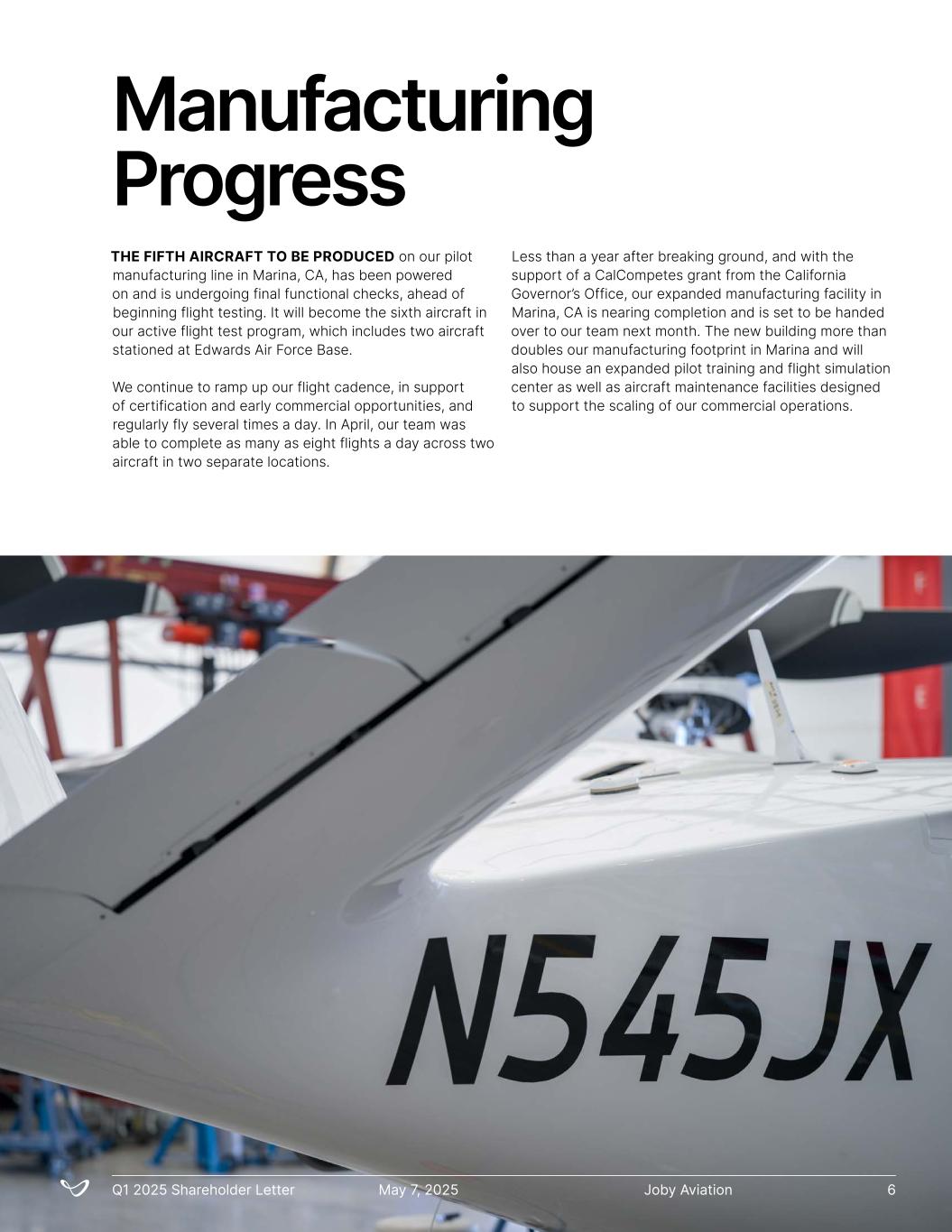 我们在加利福尼亚州马里纳的试点生产线上生产的第五架飞机已经通电,正在进行最后的功能检查,提前开始飞行测试。它将成为我们现役飞行测试计划中的第六架飞机,其中包括驻扎在爱德华兹空军基地的两架飞机。我们继续提升飞行节奏,支持认证和早期商业机会,每天定期飞行几次。4月份,我们的团队能够在两个不同地点的两架飞机上每天完成多达8次飞行。破土动工不到一年,在加利福尼亚州州长办公室的CalCompetes赠款支持下,我们位于加利福尼亚州马里纳的扩建制造工厂已接近尾声,并将于下个月移交给我们的团队。新大楼将使我们在Marina的制造足迹增加一倍以上,还将容纳一个扩大的飞行员培训和飞行模拟中心以及旨在支持我们商业运营规模的飞机维修设施。制造进展Joby AviationQ1 2025股东信2025年5月7日6
