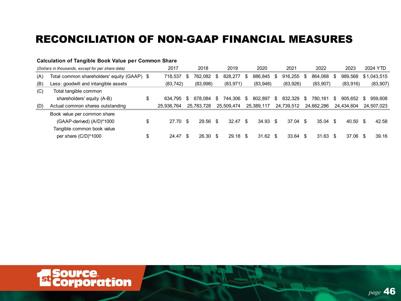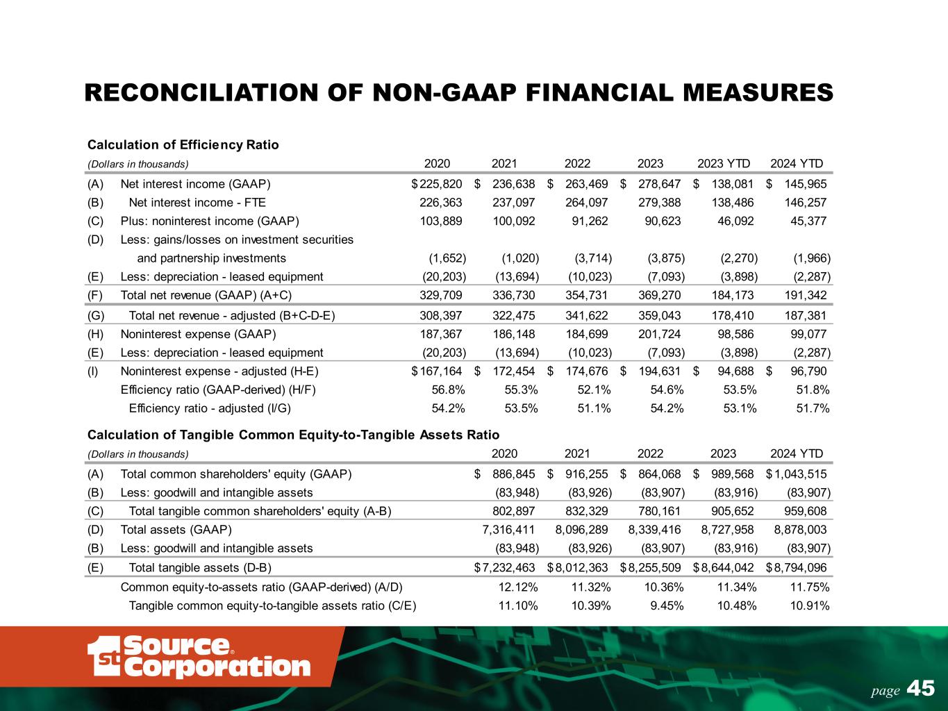 45页非公认会计原则财务措施的调节效率比率的计算(千美元)202012021202220232023 YTD 2024 YTD(a)净利息收入(GAAP)225,820美元236,638美元263,469美元278,647美元138,081美元145,965美元(b)净利息收入-FTE 226,363237,097264,097279,388138,486146,257(c)加:非利息收入(GAAP)103,889100,09291,26290,62346,09245,377(d)减:投资证券损益和合伙投资(1,652)(1,020)(3,714)(3,875)(2,270)(1,966)(e)减:折旧-租赁设备(20,203)(13,694)(10,023)(7,093)(3,898)(2,287)(f)总净收入(GAAP)(A + C)329,709336,730354,731369,270184,173191,342(G)总净收入-调整后(B + C-D-E)308,397322,475341,622359,043178,410187,381(H)非利息费用(GAAP)187,367186,148184,699201,72498,58699,077(e)减51.7%有形普通股权益与有形资产比率计算(千美元)20202021202220232024年初至今(a)普通股股东权益总额(GAAP)886,845美元916,255美元864,068美元989,568美元1,043,515美元(b)减:商誉和无形资产(83,948)(83,926)(83,907)(83,916)(83,907)(c)有形普通股股东权益总额(A-B)802,897832,329780,161905,652959,608(d)总资产(GAAP)7,316,4118,096,2898,339,4168,727,9588,878,003(b)减:商誉和无形资产(83,948)(83,926)(83,907)(83,916)(83,907)(e)有形资产总额(d-b)7,232,463美元8,012,363美元8,255,509美元8,644,042美元8,794,096美元共同权益对资产比率(GAAP派生)(A/D)12.12% 11.32% 10.36% 11.34% 11.75%有形共同权益对有形资产比率(C/E)11.10% 10.39% 9.45% 10.48% 10.91%