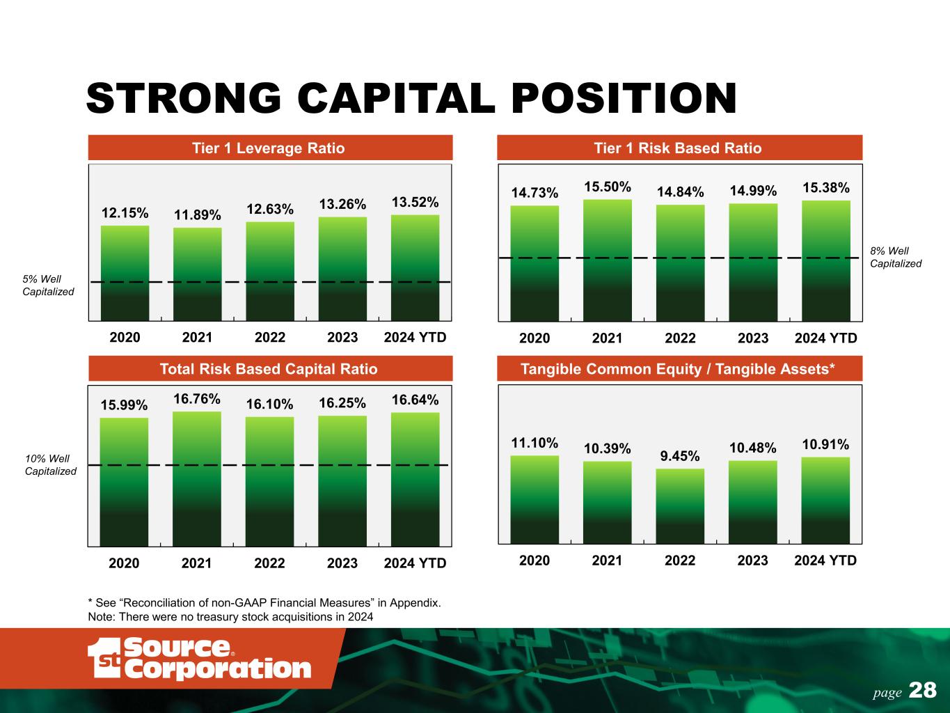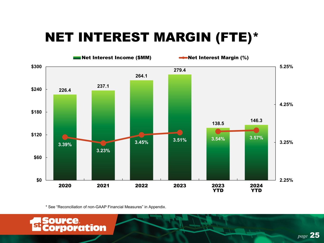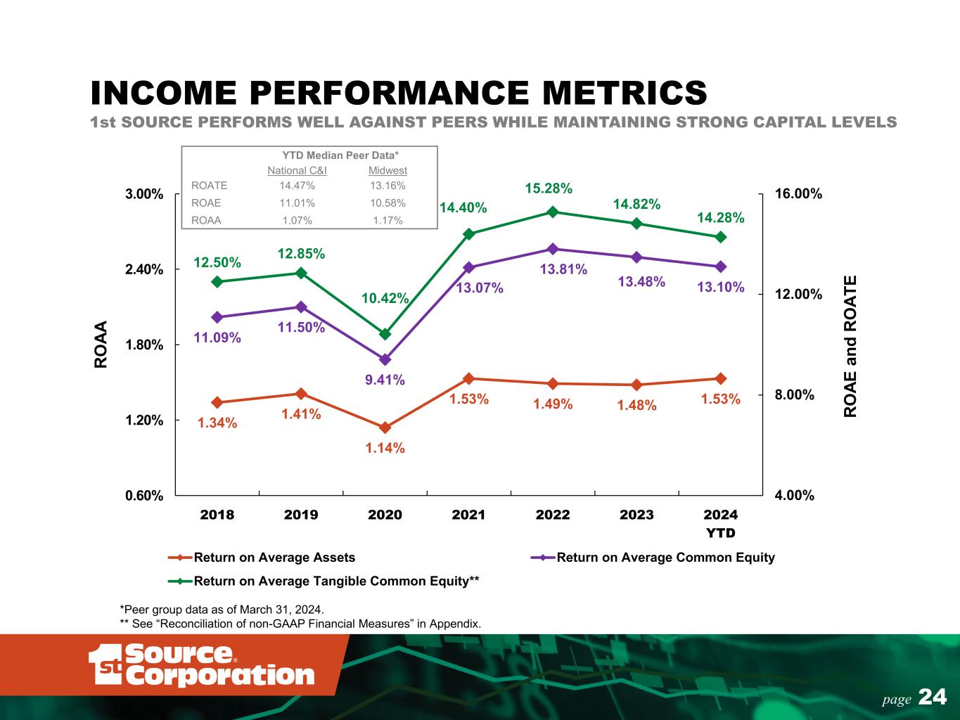 24页1.34% 1.41% 1.14% 1.53% 1.49% 1.48% 1.53% 11.09% 11.50% 9.41% 13.07% 13.81% 13.48% 13.10% 12.50% 12.85% 10.42% 14.40% 15.28% 14.82% 14.28% 4.00% 8.00% 12.00% 16.00% 0.60% 1.20% 1.80% 2.40% 3.00% 2018201920202021202220232024 YTD R O AE A nd R O at E R O AA平均资产回报率平均有形普通股本回报率* *收入业绩指标1st SORCE在保持强劲资本水平的情况下与同行相比表现良好*截至2024年3月31日的同行组数据。* *见附录中的“非GAAP财务措施的调节”。年初至今同行数据中位数*全国工商业中西部ROATE14.47 % 13.16% ROAE11.01 % 10.58% ROAA1.07 % 1.17%