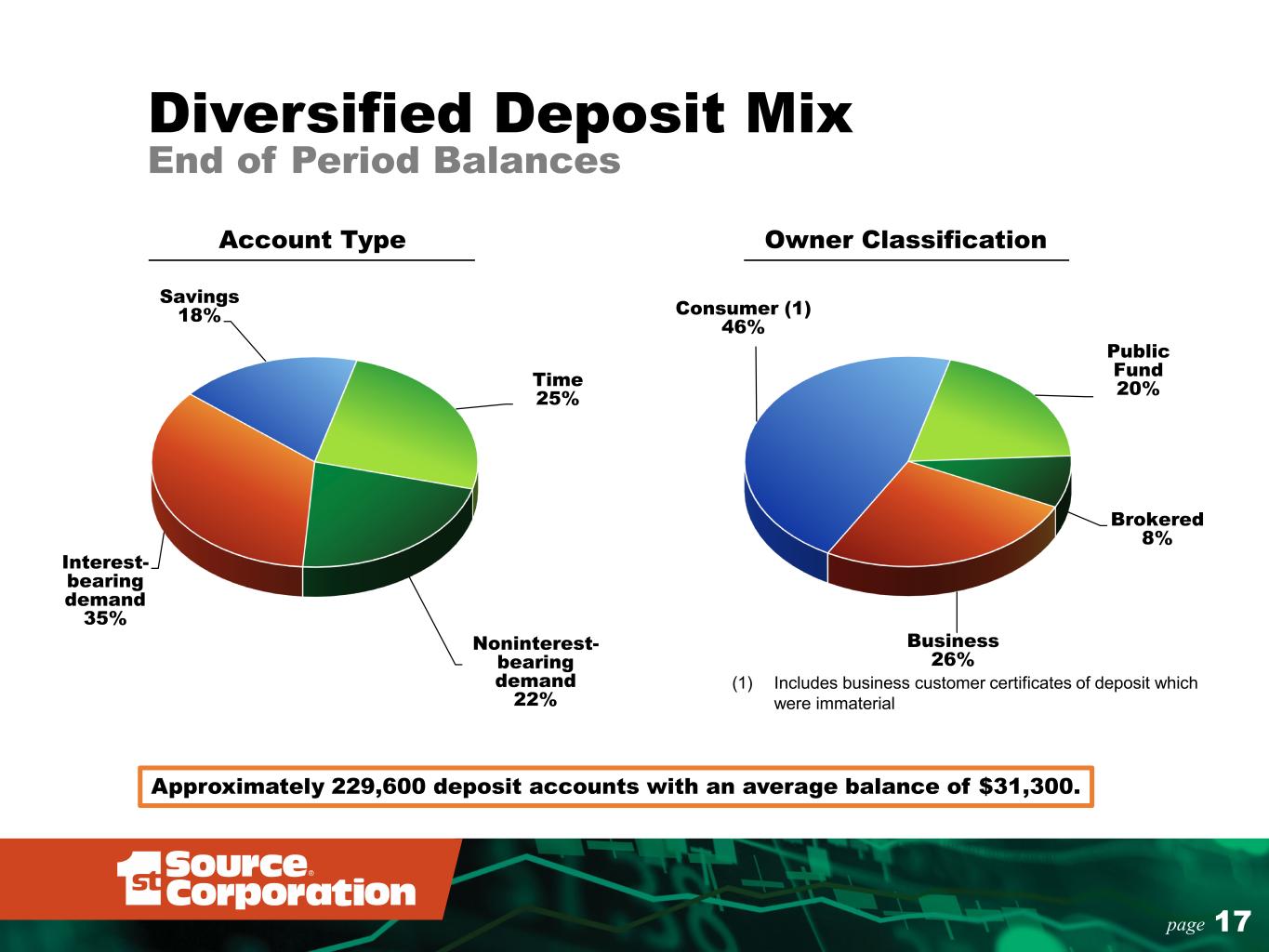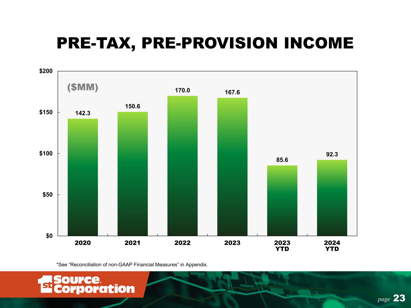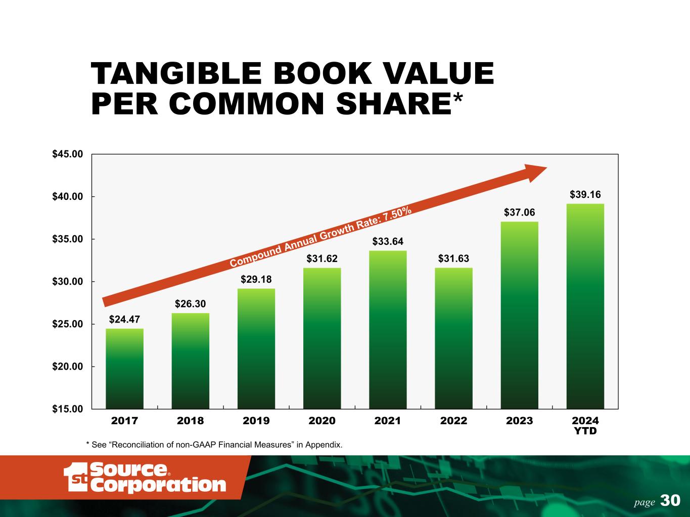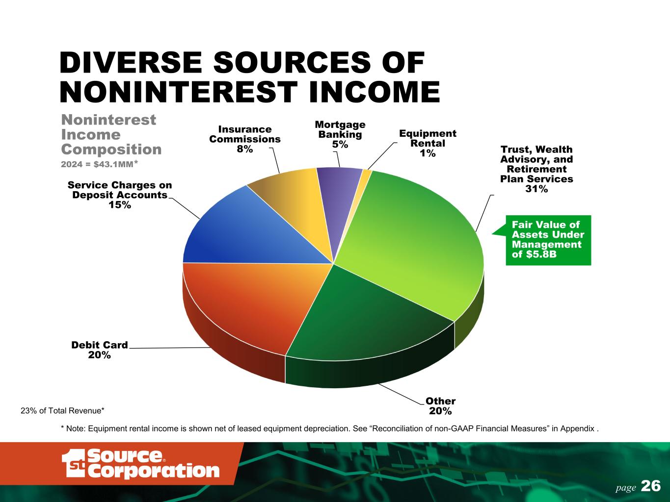 24页1.34% 1.41% 1.14% 1.53% 1.49% 1.48% 1.53% 11.09% 11.50% 9.41% 13.07% 13.81% 13.48% 13.10% 12.50% 12.85% 10.42% 14.40% 15.28% 14.82% 14.28% 4.00% 8.00% 12.00% 16.00% 0.60% 1.20% 1.80% 2.40% 3.00% 2018201920202021202220232024 YTD R O AE A nd R O at E R O AA平均资产回报率平均有形普通股本回报率* *收入业绩指标1st SORCE在保持强劲资本水平的情况下与同行相比表现良好*截至2024年3月31日的同行组数据。* *见附录中的“非GAAP财务措施的调节”。年初至今同行数据中位数*全国工商业中西部ROATE14.47 % 13.16% ROAE11.01 % 10.58% ROAA1.07 % 1.17%