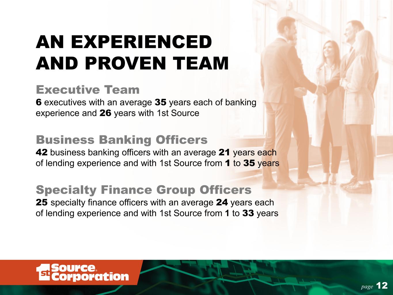 一个经验丰富且经过验证的团队执行团队6名高管,平均每人拥有35年银行从业经验和26年的第一源银行业务银行业务人员42名业务银行业务人员,平均每人拥有21年的贷款从业经验,具有1至35年的第一源银行专业金融集团干事25名专业财务人员,平均每人拥有24年的贷款从业经验,具有1至33年的第一源银行 12页