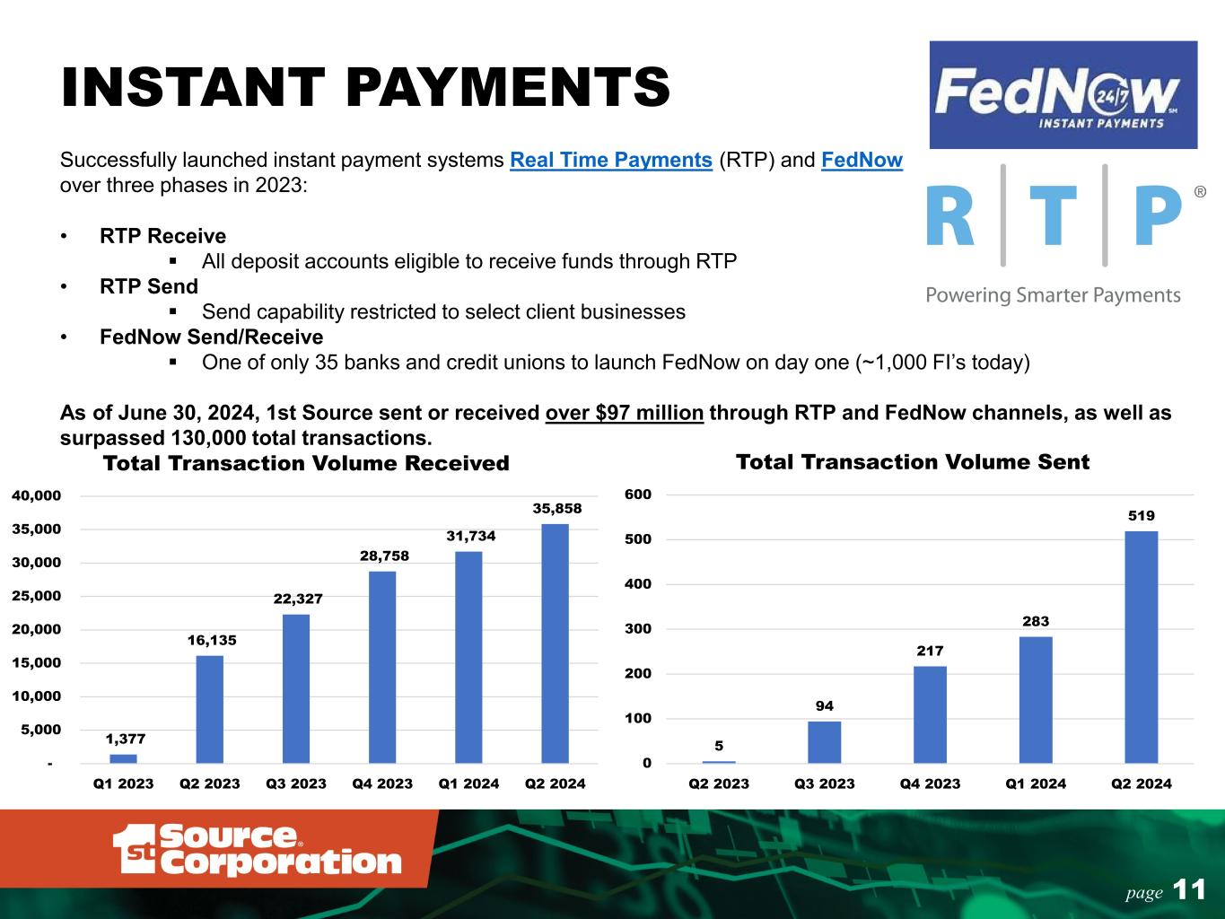 52.18 4.11 15.31 41.70 255075100125150 Q2 21 Q2 22 Q2 23 Q2 24 Zelle Transactions(000s)761.365.86 9.07 1.145.05 0.05 5.06 0.065.07 0.075.0 Q2 21 Q2 22 Q2 23 Q2 24 Mobile Users(000s)² Zelle(P2P)高评级、功能丰富的移动APP预算和账户汇总其他服务:余额和转账、支付账单/ebills、移动存款,A2A转移信用评分mgmt.丨借记卡控制数字钱包1“数字采用”基于主要存款账户持有人对我们的网上/手机银行平台的使用情况2“移动用户”基于过去90天内移动App内的活动3“服务使用情况”为数字用户使用的不同服务数量(如左图所示)4于2022年5月推出的服务5 第一源银行借记卡可装入Apple Pay、Samsung Pay和Google钱包Apps 6。基于苹果App Store在7季度末的评级。一些先前报告的季度交易已被修改。…第10页8K评级9.4K评级4.8 9.4K评级657% 62% 64% 67% 16% 14% 13% 12% 27% 24% 23% 21% 0% 25% 50% 75% 100% Q2 21 Q2 22 Q2 23 Q2 24数字采纳丨移动和在线仅限非数字21% 27% 28% 32% 25% 23% 23% 23% 34% 27% 27% 25% 20% 23% 22% 20% 0% 25% 50% 75% 100% Q2 21 Q2 22 Q2 23 Q2 24服务使用情况↓ 4 + 321