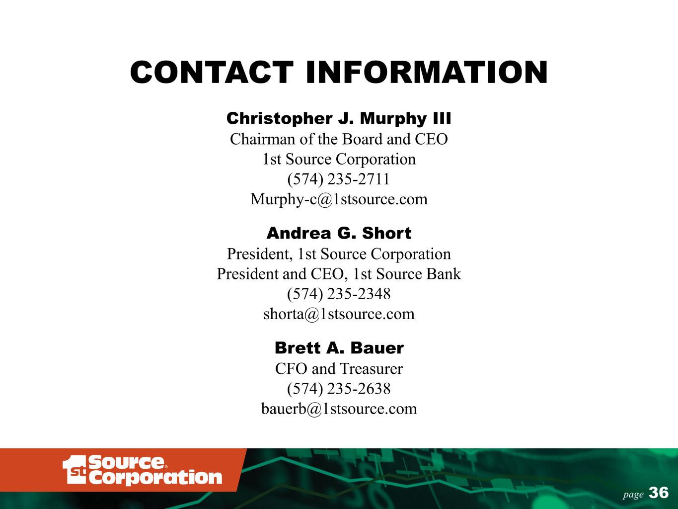 联系方式Christopher J. Murphy III董事会主席兼首席执行官1st Source Corporation(574)235-2711 murphy-c@1stsource.com丨Andrea G. Short Andrea G. Short总裁、1st Source Corporation总裁兼首席执行官、第一源银行银行(574)235-2348 shorta@1stsource.com Brett A. Bauer首席财务官兼财务主管(574)235-2638 bauerb@1stsource.com 36page
