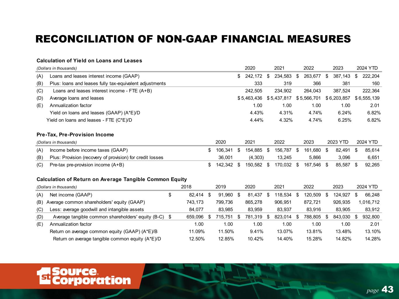 43页非公认会计原则财务措施的调节计算贷款和租赁的收益率(千美元)202012021202220232024年初至今(a)贷款和租赁利息收入(GAAP)242,172美元234,583美元263,677美元387,143美元222,204美元(b)加:贷款和租赁完全等税调整333319366381160(c)贷款和租赁利息收入-FTE(A + B)242,505234,902264,043387,524222,364(d)平均贷款和租赁5,463,436美元5,437,817美元5,566,701美元6,203,857美元6,555,139美元(e)年化系数1.00 1.00 1.00 1.00 2.01贷款和租赁收益率(GAAP)(A * E)/和租赁-FTE(C * E)/D4.44% 4.32% 4.74% 6.25% 6.82%税前,拨备前收入(千美元)202020212022202320232023YTD 2024 YTD(A)所得税前收入(GAAP)106,341美元154,885美元156,787美元161,680美元82,491美元85,614美元(b)加:信用损失拨备(收回拨备)36,001(4,303)13,2455,8663,0966,651(C)税前拨备前收入(A + B)142,342美元150,582美元170,032美元167,546美元85,587美元92,265美元平均有形普通股权益回报率的计算(千美元)2018201920202021202220232024 YTD(A)净收入(GAAP)82,414美元91,960美元81,437美元118,534美元120,509美元124,927美元和无形资产84,07783,98583,95983,93783,91683,90583,912(d)平均有形普通股股东权益(B-C)659,096美元715,751美元781,319美元823,014美元788,805美元843,030美元932,800美元(e)年化系数1.00 1.00 1.00 1.00 1.00 1.00 2.01平均普通股权益回报率(GAAP)(A * E)/B 11.09% 11.50% 9.41% 13.07% 13.81% 13.48% 13.10%平均有形普通股权益回报率(A * E)/D 12.50% 12.85% 10.42% 14.40% 15.28% 14.82% 14.28%平均普通股股东权益(GAAP)