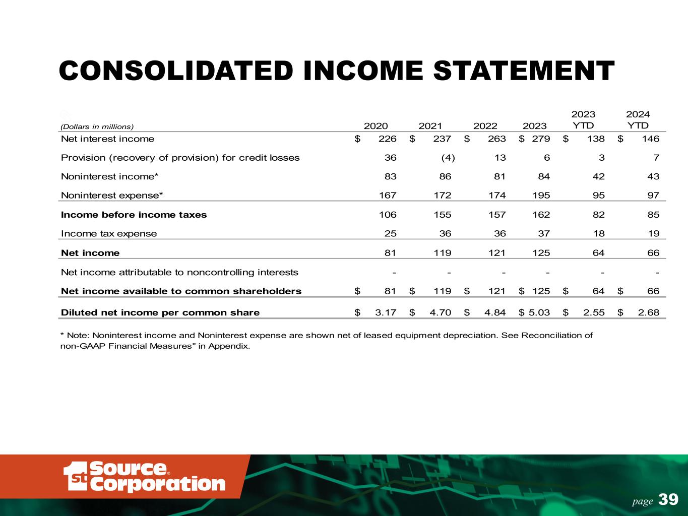 合并资产负债表38页(百万美元)20202021202220232024年初至今现金和现金等价物243美元525美元123美元130美元269美元投资证券和其他投资* 1,2251,8901,8001,6481,548贷款和租赁,扣除未实现贴现5,5025,3606,0156,5206,656贷款和租赁损失准备金(141)(127)(139)(148)(150)经营租赁项下拥有的设备,净额6548322014其他资产422400508558541总资产7,316 $ 8,096 $ 8,339 $ 8,728 $ 8,878 $无息存款1,637 $ 2,053 $ 1,998 $ 1,656 $ 1,579 $计息存款4,3094,6264,9305,3835,617存款总额5,9466,6796,9287,0397,196借款总额291330321419386其他负债148118166202181股东权益总额8879168649891,044非控制性权益4453607971总权益9319699241,0681,115 总负债及权益 7,316 $ 8,096 $ 8,339 $ 8,728 $ 8,878 $ *所有投资证券均可出售。本公司未持有任何持有至到期投资证券。