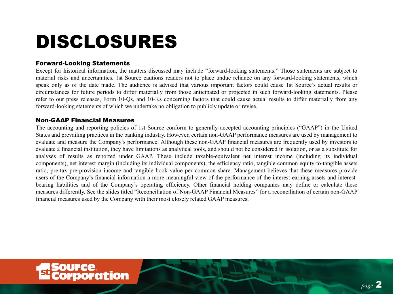 披露前瞻性陈述除历史信息外,讨论的事项可能包括“前瞻性陈述”。这些声明受到重大风险和不确定性的影响。第一源银行提醒读者不要过分依赖任何前瞻性陈述,这些陈述仅代表所作日期。受众请注意,各种重要因素可能导致第一源银行未来期间的实际结果或情况与此类前瞻性陈述中的预期或预测存在重大差异。请参阅我们的新闻稿、表格10-Q和10-K,这些因素可能导致实际结果与我们不承担公开更新或修改义务的任何前瞻性陈述存在重大差异。非GAAP财务指标第一源银行的会计和报告政策符合美国公认会计原则(“GAAP”)和银行业的通行做法。然而,管理层使用某些非公认会计准则业绩衡量标准来评估和衡量公司的业绩。尽管投资者经常使用这些非GAAP财务指标来评估一家金融机构,但它们作为分析工具具有局限性,不应孤立地考虑,或作为根据GAAP报告的结果分析的替代品。其中包括应税等值净利息收入(包括其个别组成部分)、净息差(包括其个别组成部分)、效率比率、有形普通股权益与有形资产比率、税前拨备前收入和每股普通股有形账面价值。管理层认为,这些措施为公司财务信息的使用者提供了一个更有意义的视角,以了解生息资产和计息负债的表现以及公司的经营效率。其他金融控股公司可能会对这些衡量标准进行不同的定义或计算。有关公司使用的某些非GAAP财务指标与其最密切相关的GAAP指标的对账,请参阅标题为“非GAAP财务指标的对账”的幻灯片。2页