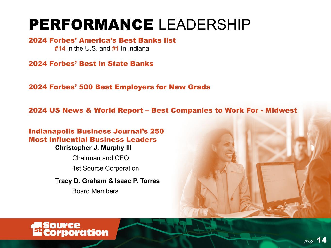 业绩领导力2024年福布斯美国最佳银行榜单美国排名# 14、印第安纳州排名# 2024年福布斯州立银行最佳榜单2024年福布斯500位新毕业生最佳雇主2024年美国新闻与世界报道–最适合工作的公司-中西部印第安纳波利斯商业杂志250位最具影响力的商业领袖Christopher J. Murphy III董事长兼首席执行官1st Source Corporation丨特雷西D.格雷厄姆Tracy D. Graham &艾萨克·P·托雷斯董事会成员14页
