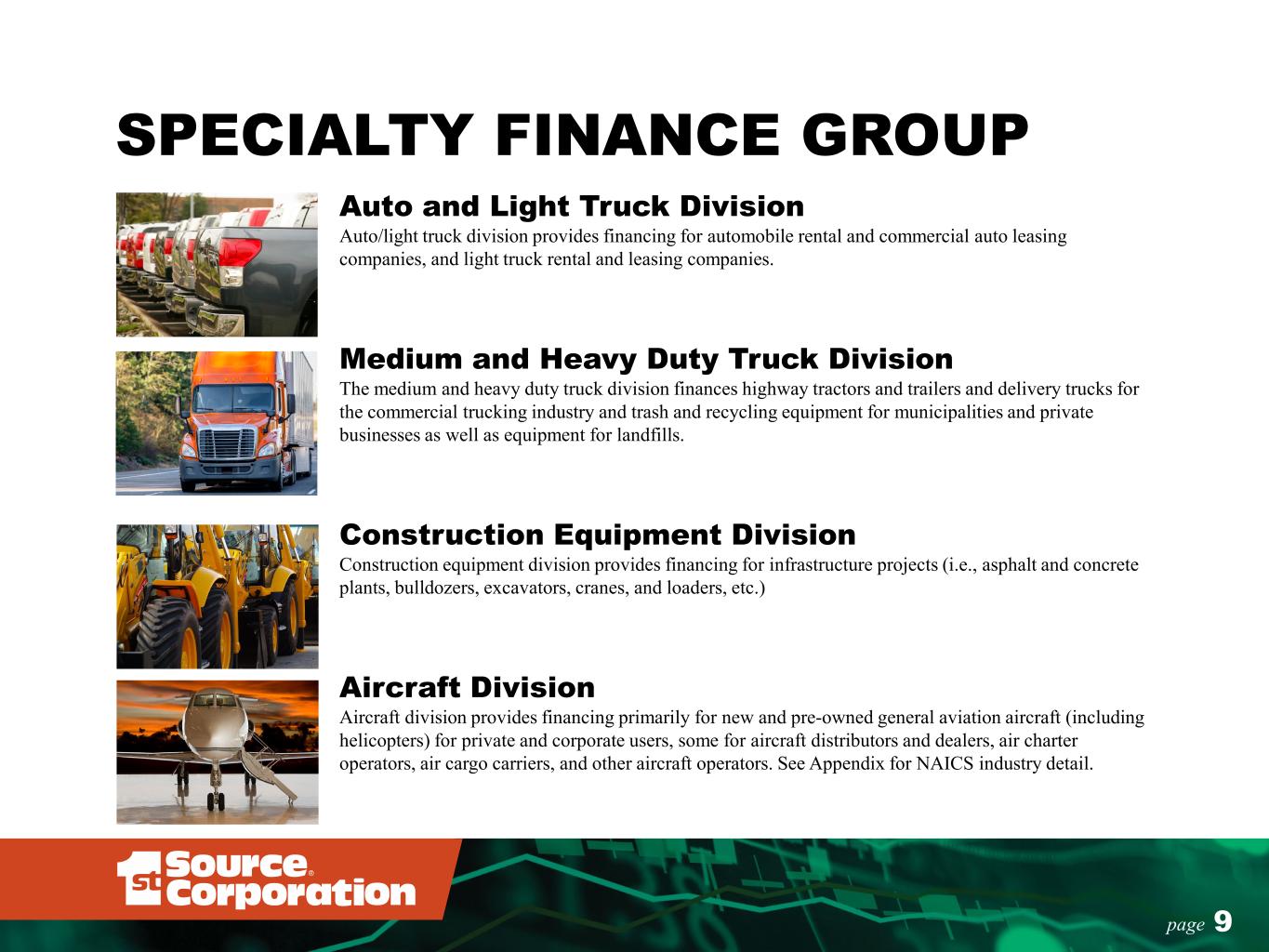 Specialty Finance Group Auto and Light Truck Division Auto/Light Truck Division为汽车租赁和商业汽车租赁公司以及轻型卡车租赁和租赁公司提供融资。中重型卡车部门中重型卡车部门为公路牵引车、拖车和商用卡车运输行业的送货卡车以及市政当局和私营企业的垃圾和回收设备以及垃圾填埋场的设备提供资金。建筑设备部门建筑设备部门为基础设施项目(即沥青和混凝土厂、推土机、挖掘机、起重机和装载机等)提供融资。飞机部门飞机部门主要为私人和企业用户的新的和二手通用航空飞机(包括直升机)提供融资,有些为飞机分销商和经销商、包机运营商、航空货运公司和其他飞机运营商提供融资。NAICS行业详情见附录。9页