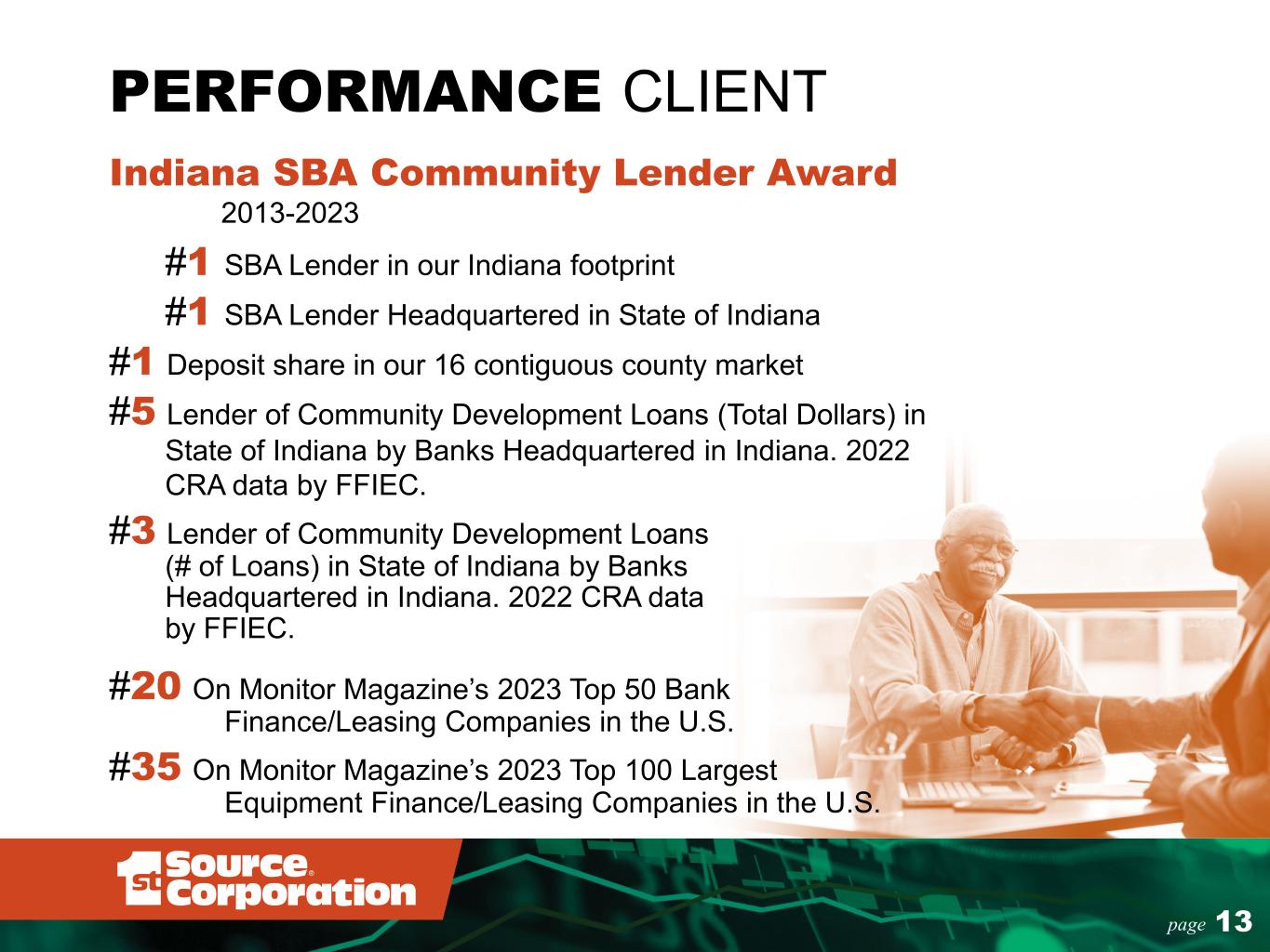 业绩客户印第安纳州SBA社区贷款人奖2013-2023 #我们印第安纳州足迹中的1个SBA贷款人# 1个总部位于印第安纳州的SBA贷款人#我们16个毗连县市场中的1个存款份额# 5个总部位于印第安纳州的银行在印第安纳州的社区发展贷款(总美元)贷款人。FFIEC提供的2022年CRA数据。# 3总部设在印第安纳州的银行在印第安纳州的社区发展贷款(# of loans)贷款人。FFIEC提供的2022年CRA数据。# 20上榜《Monitor》杂志2023美国50大银行融资/租赁公司# 35上榜《Monitor》杂志2023美国100大设备融资/租赁公司13页