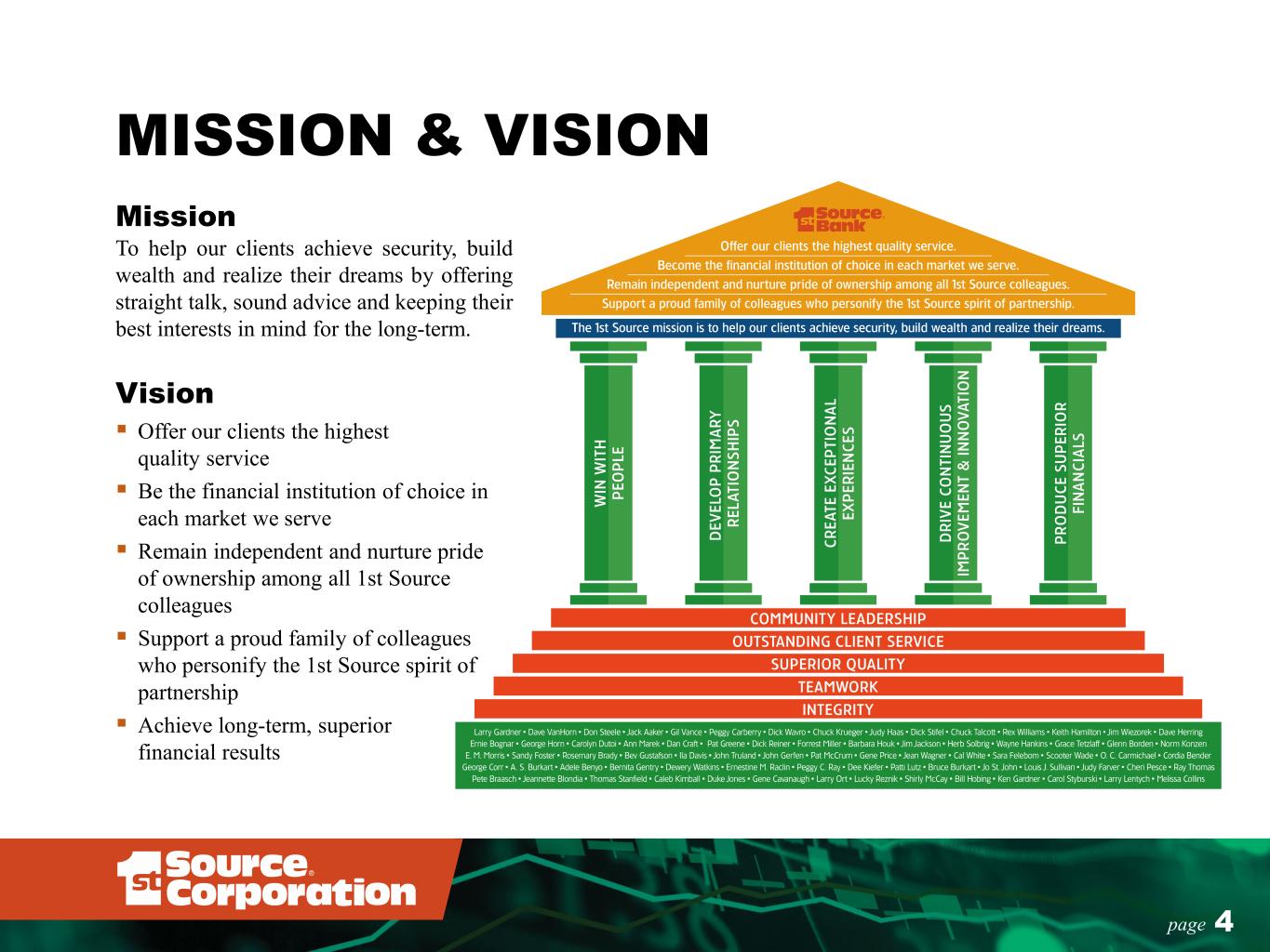 MISSION & VISION 4page Mission通过提供直接的谈话、合理的建议和长期牢记客户的最大利益,帮助我们的客户实现安全、积累财富和实现他们的梦想。愿景为我们的客户提供最优质的服务成为我们所服务的每个市场中的首选金融机构在所有第一源银行同事中保持独立并培育主人翁的自豪感支持一个引以为豪的同事大家庭,他们化身了第一源银行合作精神,实现长期、优越的财务业绩
