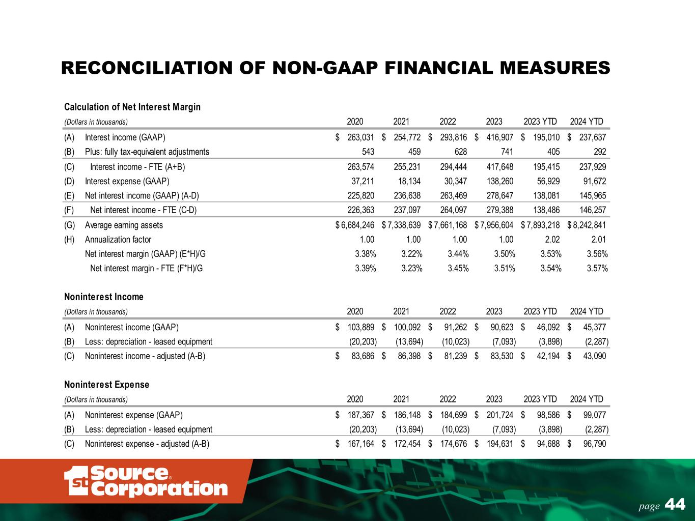 44页非公认会计原则财务措施的对账计算净息差(千美元)202012021202220232023年初至今2024年初至今(a)利息收入(GAAP)263,031美元254,772美元293,816美元416,907美元195,010美元237,637美元(b)加:完全等税调整数543459628741405292(c)利息收入-FTE(A + B)263,574255,231294,444417,648195,415237,929(d)利息支出(GAAP)37,21118,13430,347138,26056,92991,672(e)净利息收入(GAAP)(A-D)225,820236,638263,469278,647138,0(h)年化系数1.00 1.00 1.00 2.02 2.01净息差(GAAP)(E * H)/G 3.38% 3.22% 3.44% 3.50% 3.53% 3.56%净息差-FTE(F * H)/G 3.39% 3.23% 3.45% 3.51% 3.54% 3.57%非利息收入(千美元)20202021202220232023 YTD 2024 YTD(A)非利息收入(GAAP)103,889美元100,092美元91,262美元90,623美元46,092美元45,377美元(b)减:折旧-租赁设备(20,203)(13,694)(10,023)(7,093)(3,898)(2,287)(c)非利息收入-调整后(A-B)83,686美元86,398美元81,239美元83,5美元201,724美元98,586美元99,077美元(b)减:折旧-租赁设备(20,203)(13,694)(10,023)(7,093)(3,898)(2,287)(c)非利息费用-调整后(A-B)167,164美元172,454美元174,676美元194,631美元94,688美元96,790美元