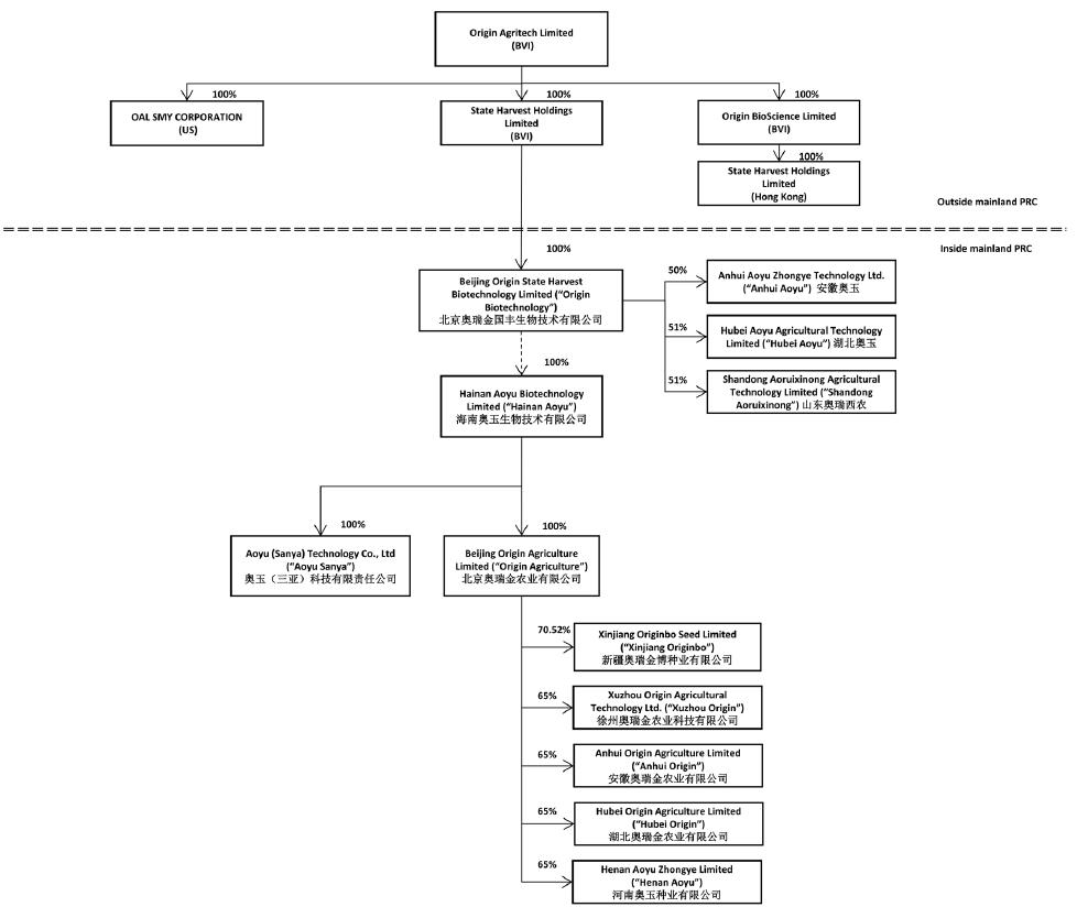 投资者持有股份的公众公司,奥瑞金种业股份有限公司,简称奥瑞金种业或Origin,是一家在英属维尔京群岛注册成立的控股公司。目前,我们所有的业务活动都是通过母公司奥瑞金种业以下的各公司在中国开展的。我们的部分业务是通过可变利益企业或VIE在中国进行的。业务中属于VIE的部分为海南奥宇及其子公司。我们的运营余额是通过在Origin Biotechnology内或在Origin Biotechnology下的全部和部分股权拥有的运营进行的,而Origin Biotechnology又是State Harvest Holdings Limited(“State Harvest”)拥有的100%股权。因为是多层控股公司结构,所有运营公司都在中国,所以奥瑞金种业的一个投资者可能永远也不会拥有这些中国公司的股权。