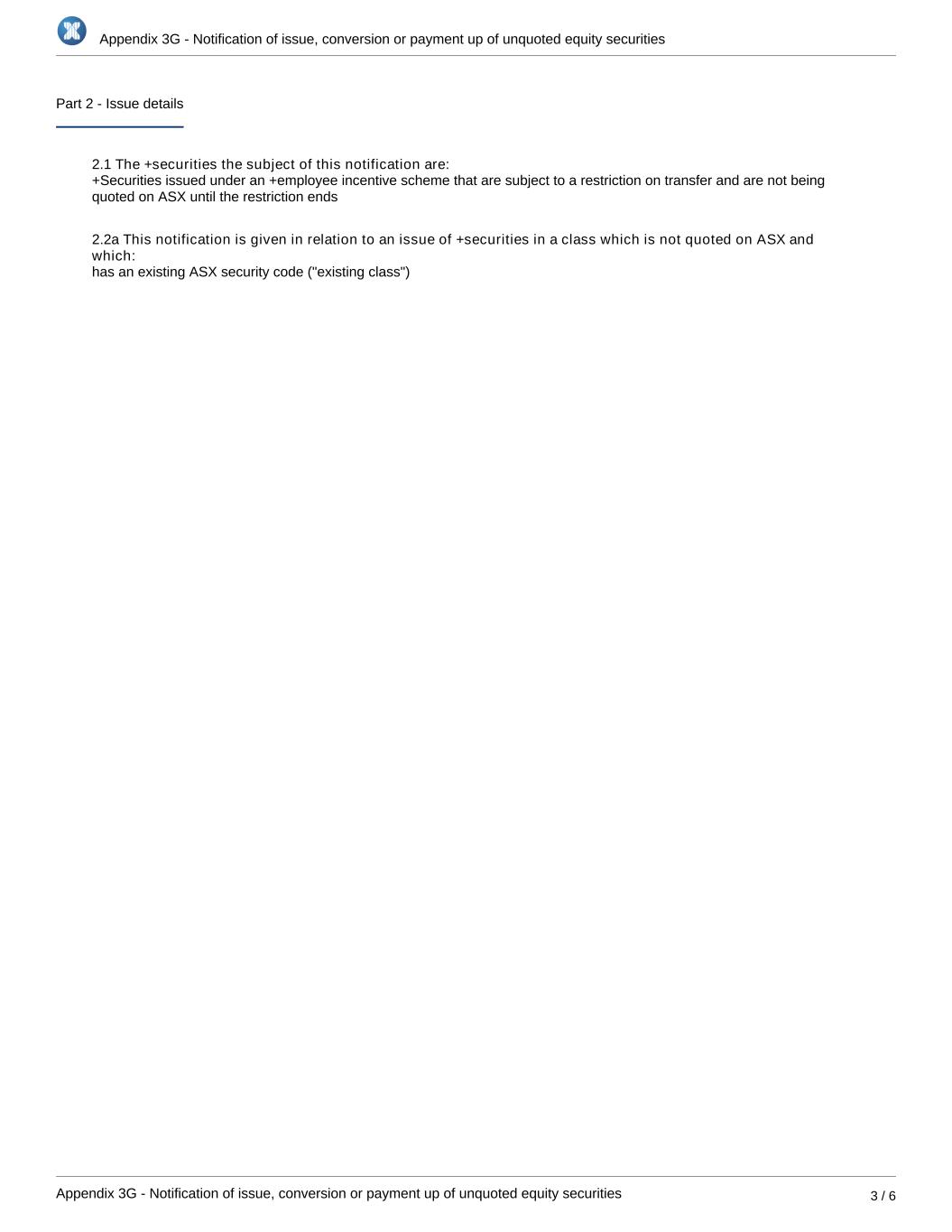 附录3G-未上市股本证券的发行、转换或缴款通知附录3G-发行通知,未上市股本证券的转换或缴款3/6第2部分-发行详情2.1本通知标的的+证券为:2.2a本通知是针对某类别中的+证券发行的,该类别未在ASX报价,且该类别:具有现有的ASX证券代码(“现有类别”)+根据+员工激励计划发行的证券,该证券受转让限制,且在限制结束前不在ASX报价