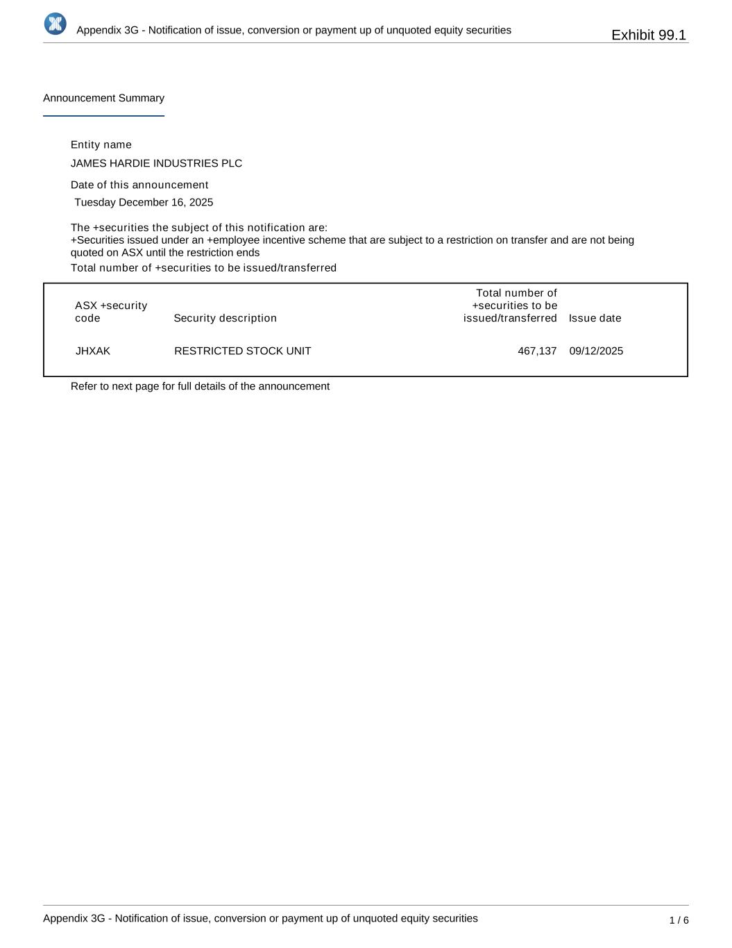 附录3G-未上市股本证券的发行、转换或缴款通知附录3G-发行通知,未上市股本证券的转换或缴款4/6第3B部分-本通知标的(现有类别)的+证券的数量和类型,如果发行之前未在附录3B中通知ASX根据+员工激励计划发行的现有类别中的附加+证券丨+证券代码和说明JHXAK:限制性股票单位日期本通知标的的+证券发行日期9/12/2025这些+证券自其发行日期起是否在所有方面与现有已发行+证券享有同等地位那一类是向+关键管理人员(KMP)或+合伙人发行的+证券吗?请提供向ASX提交的文件的URL链接,详细说明+员工激励计划的条款或参考2001年计划的条款摘要:https://ir.jameshardie.com.au/public/download.jsp?id=5562参考2006年计划:https://ir.jameshardie.com.au/public/download.jsp?id=5390该实体希望提供的有关本通知标的的+证券的任何其他信息根据《2001年詹姆斯哈迪股权激励计划》(2001年计划)授予的456,783个限制性股票单位(RSU)和根据《2006年詹姆斯哈迪激励计划》(2006年计划)授予的10,354个基于绩效的TSR RSU。https://ir.jameshardie.com。