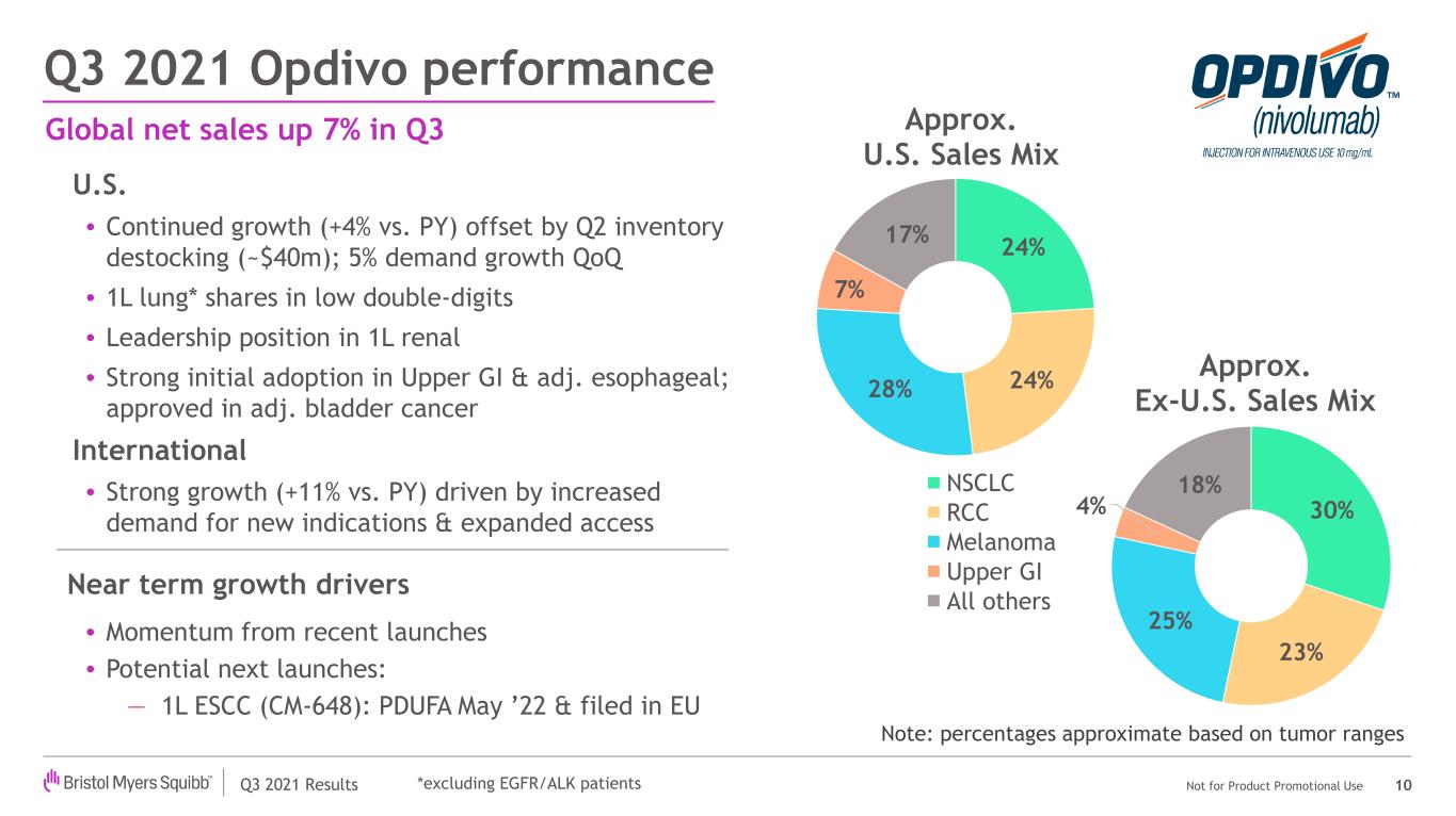2021年第三季度业绩用于产品促销用途的全球净销售额在美国第三季度增长了7%•持续增长(与PY相比增长了4%),但被第二季度库存减少(约4000万美元)所抵消;需求增长了5%•1升肺*的股票处于低两位数•1升肾脏的领导地位•上消化道和ADJ的首次采用率很高。食道;在国际膀胱癌组织中获得批准•强劲增长(与PY相比增长11%),这是由对新适应症的需求增加和扩大访问范围所驱动的2021年第三季度Opdivo性能1024%24%28%7%17%左右。美国销售组合注:基于肿瘤范围的百分比约为30%23%25%4%18%左右。美国以外的销售组合NSCLC RCC黑色素瘤上消化道所有其他近期增长动力•近期上市的势头•潜在的下一次上市:-1升ESCC(CM-648):PDUFA5月22日在欧盟提交*不包括EGFR/ALK患者
