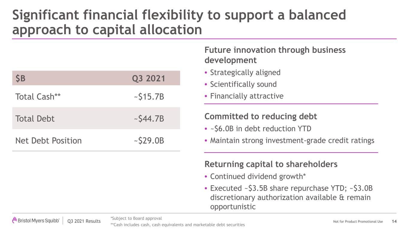 2021年第三季度业绩不用于产品促销使用显著的财务灵活性以支持资本分配的平衡方法14b2021年第三季度总现金**~157亿美元总债务~447亿美元净债务头寸~29亿美元*有待董事会批准**现金包括现金,现金等价物以及致力于减少债务的可交易债务证券•年初至今减少约60亿美元债务•维持强劲的投资级信用评级向股东返还资本•持续的股息增长*•年初至今执行约35亿美元的股票回购;约30亿美元的可自由支配授权&通过业务发展保持机会主义的未来创新•战略一致•科学合理•在财务上具有吸引力