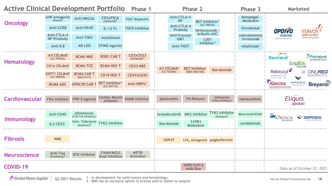 截至10月27日,2021年第三季度结果不用于产品促销用途血液学纤维化HSP47LPA1拮抗剂免疫学肿瘤学数据, 抗CTLA-4NF抗CCR8抗CTLA-4前体BCMA TCE CD3XPSCA2IL-12FC抗IL8抗Tigit BET抑制剂(BMS-986158)CD19NEX T BCMA ADC BCMA CAR T(BB21217)TGF LSD1抑制剂1-Iberdomide1和血液学;2-BMS拥有获得Iberdomide MK2抑制剂和CD40IL2-CD25IMM的独家选择权。耐受2cendakimab branebrutinib deucravacitinib心血管fa-relaxifxia抑制剂18 1期2期3a/i celmod(cc-92480)a/i celmod(cc-99282)gspt1celmod(cc-90009)bet抑制剂1(cc-90010)cd33nke cd47xcd20神经科学抗tau(prothena)2ahr拮抗剂(ikena)2s1pr1调节剂pr7/8抑制剂bet1(cc-95775)nme活性临床抑制剂开发组合STING激动剂Danicamtiv BCMA NEX T motolimod心肌肌球蛋白抑制剂Milvexian(FXIA抑制剂)Mavacamten CD3XCD33 2TYK2抑制剂TYK2抑制剂2GPRC5D CAR T新冠病毒SARS-CoV-2单抗双抗CTLA-4NF-前体CK1Celmod ROMK抑制剂BTK抑制剂BCMA NKE ROR1CAR T抗-TIM3Farletuzumab-Eribulin FAAH/MGLL双重抑制剂Relatlimab1BempeGal-Desleukin Linrodostat皮下niiiiiiiiiiiif2B pegBelfermin上市