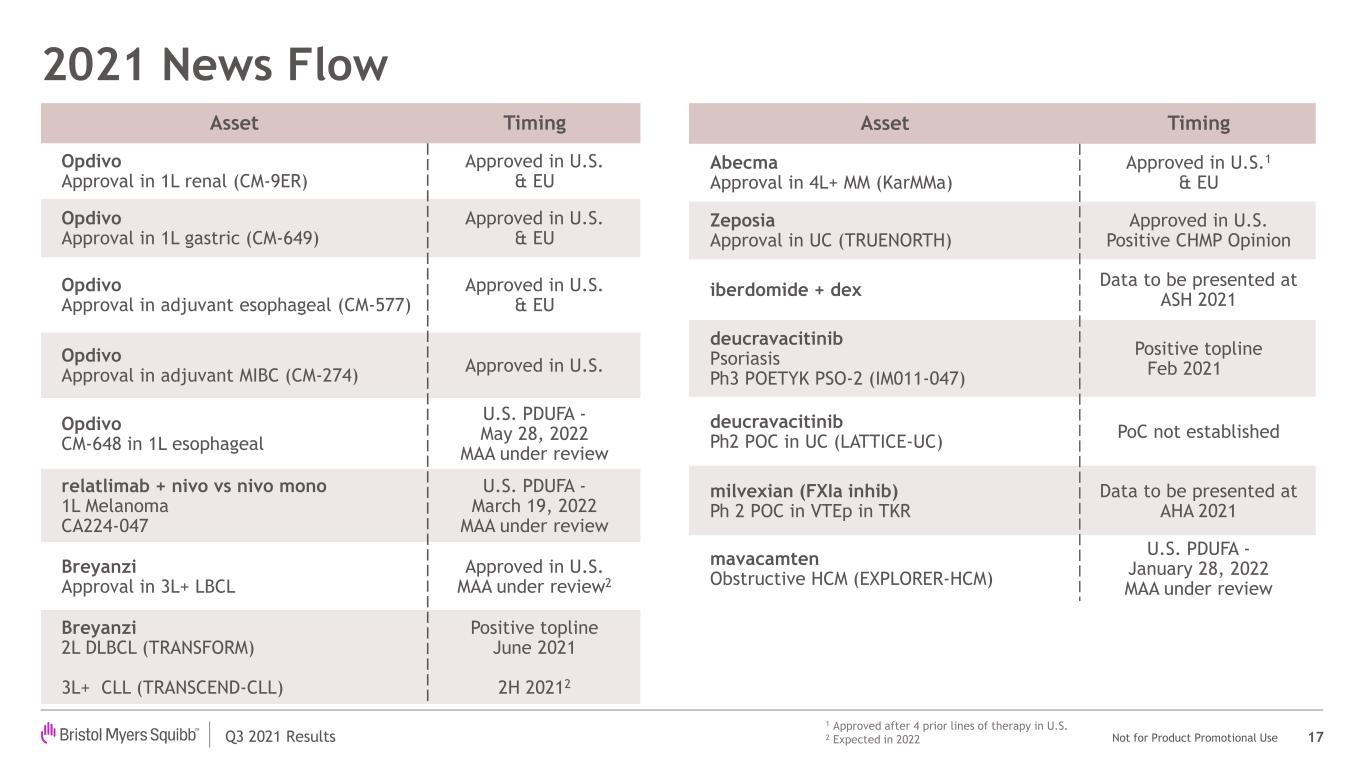 2021年第三季度业绩用于产品促销用途2021年新闻流程17资产定时Opdivo批准在1L肾脏(CM-9ER)中批准在美国和欧盟批准Opdivo批准在1L胃(CM-649)中批准在美国和欧盟批准Opdivo批准在辅助食管(CM-577)中批准在美国和欧盟批准Opdivo批准在辅助MIBC中批准(CM-274)在美国Opdivo CM-648在1L食道美国PDUFA-5月28日, 2022MAA正在审查Relatlimab+Nivo vs Nivo Mono1L黑色素瘤CA224-047美国PDUFA-3月19日, 2022年MAA在审中Breyanzi批准在3L+LBCL在美国批准MAA在审中2Breyanzi2L DLBCL3L+CLL正顶线2021年6月2H20212资产定时ABECMA批准在4L+MM在美国批准1和欧盟Zeposia批准在UC批准在美国批准正CHMP Opinion Iberdomide+DEX数据将在ASH2021上发表Deucravacitinib银屑病Ph3Poetyk PSO-2(IM011-047)阳性顶线2021年2月UC中的Deucravacitinib Ph2Poc未在TKA数据中建立Milvexian Ph2Poc 阻塞性HCM美国PDUFA-1月28日, 2022年MAA在审1,在美国4个先前的治疗线之后,预计将于2022年在美国2,