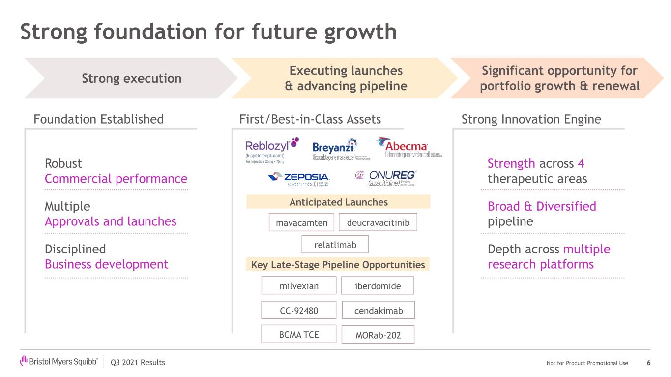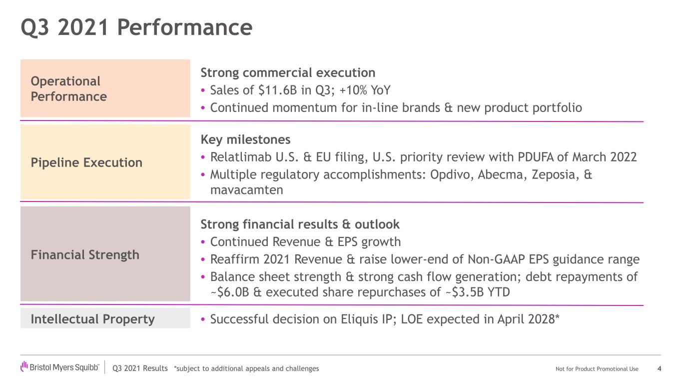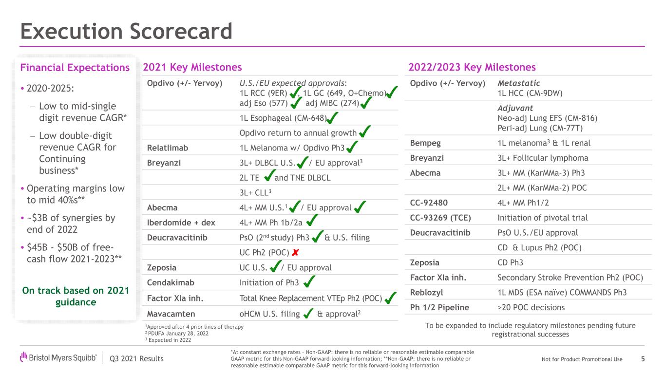 2021年第三季度不用于产品促销用途的业绩运营表现强劲的商业执行•第三季度销售额为116亿美元;同比增长10%•线上品牌和新产品组合的持续势头执行关键里程碑•Relatlimab美国和欧盟备案,2022年3月PDUFA的美国优先审查•多项监管成就:Opdivo,Abecma,Zeposia,财务实力强劲财务业绩和前景强劲•收入和每股收益持续增长•重申2021年收入并提高非GAAP每股收益指导范围的低端•资产负债表实力和强劲的现金流产生;偿还债务约6.0亿美元,并执行约35亿美元的股票回购知识产权•关于Eliquis IP的成功决定;预计将于2028年4月生效*2021年第三季度的性能4*取决于其他上诉和挑战
