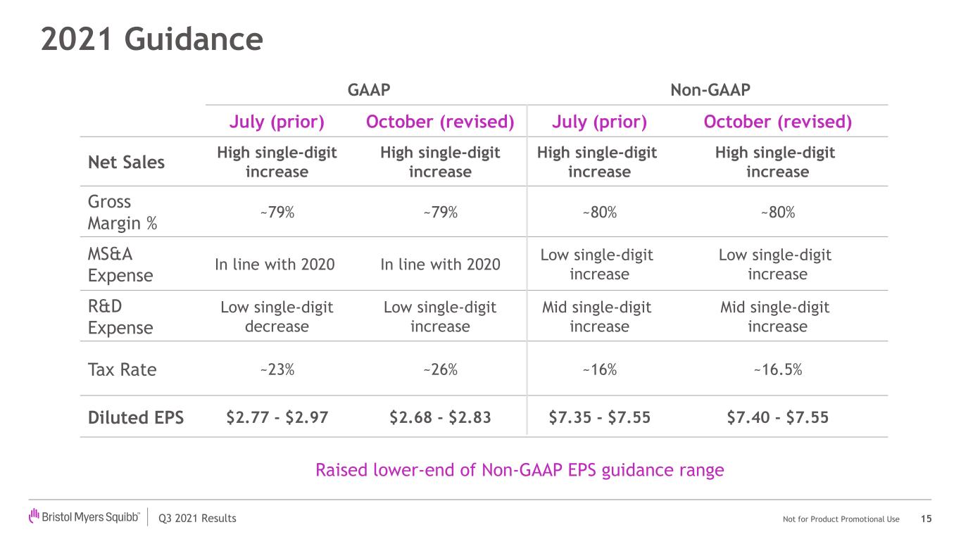 2021年第三季度业绩用于产品促销的2021年指导15GAAP非GAAP7月(前)10月(修订)7月(前)10月(修订)净销售额高单位数增长高单位数增长高单位数增长高单位数增长毛利率%~79%~79%~80%MS&A费用符合2020年符合2020年符合低单位数上调低个位数涨幅研发费用低个位数跌幅低个位数涨幅中个位数涨幅中个位数涨幅税率~23%~26%~16%~16.5%摊薄EPS$2.77-$2.97$2.68-$2.83$7.35-$7.55$7.40-$7.55上调非GAAP EPS指引区间下端