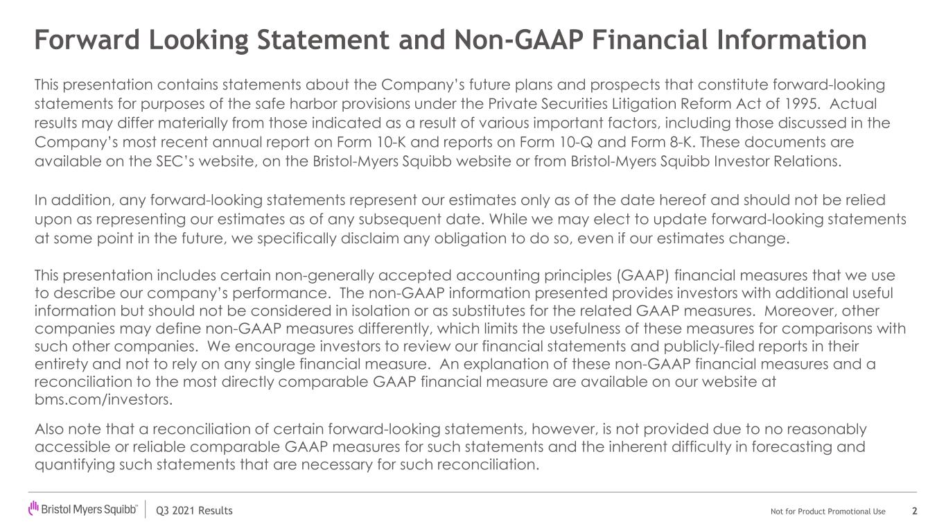 本演示文稿包含有关公司未来计划和前景的陈述,就1995年《私人证券诉讼改革法》中的安全港条款而言,这些陈述构成了前瞻性陈述。由于各种重要因素,实际结果可能与所示结果大不相同, 包括该公司最新的10-K表年度报告以及10-Q表和8-K表报告中讨论的内容,这些文件可在SEC网站上获得, 在百时美施贵宝网站或从百时美施贵宝投资者关系。另外, 任何前瞻性陈述仅代表我们截至本文发布之日的估计,不应被视为代表我们截至随后任何日期的估计。虽然我们可能会选择在未来的某个时候更新前瞻性陈述, 我们明确表示不承担这样做的义务, 即使我们的估计改变了。本演示文稿包括我们用来描述公司业绩的某些非公认会计原则财务指标。介绍的非GAAP信息为投资者提供了额外的有用信息,但不应孤立地考虑或替代相关的GAAP指标。此外, 其他公司对非GAAP指标的定义可能有所不同, 这限制了这些衡量标准与其他公司进行比较的实用性。我们鼓励投资者全面审查我们的财务报表和公开提交的报告,不要依赖任何单一的财务指标。有关这些非GAAP财务指标的解释以及与最直接可比的GAAP财务指标的对账可在我们的网站BMS.com/Investors上获得。还应注意对某些前瞻性陈述的协调, 然而, “由于此类声明没有合理可获得或可靠的可比较GAAP指标,并且在预测和量化此类对账所必需的此类声明方面存在固有的困难,因此未提供此类声明。,