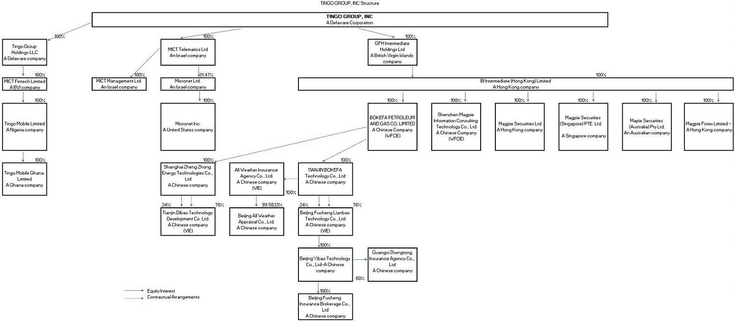 本公司是一家控股公司,通过其子公司和实体开展金融科技业务和农业金融科技业务,这些子公司和实体通过各种VIE安排(“VIE实体”,与本公司合称“集团”)全资拥有和控股,主要位于非洲、东南亚和中东。自2022年12月1日以来,在完成对Tingo Mobile和Tingo Foods的两项重大收购后,集团的业务发生了重大变化,具体情况见下文“收购Tingo Mobile、收购Tingo Foods和关于Tingo Group控股”。