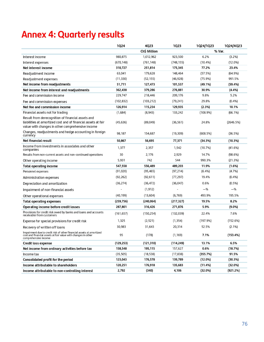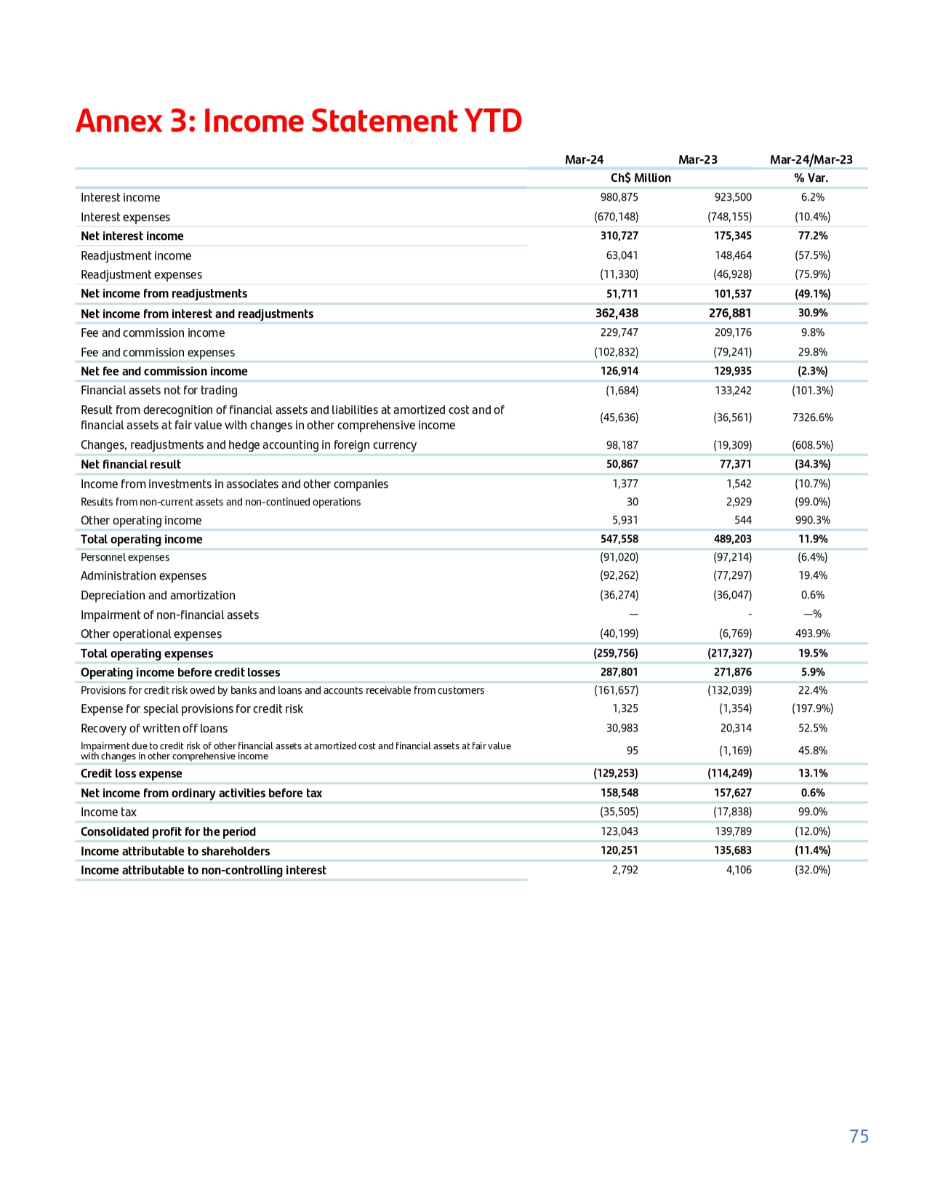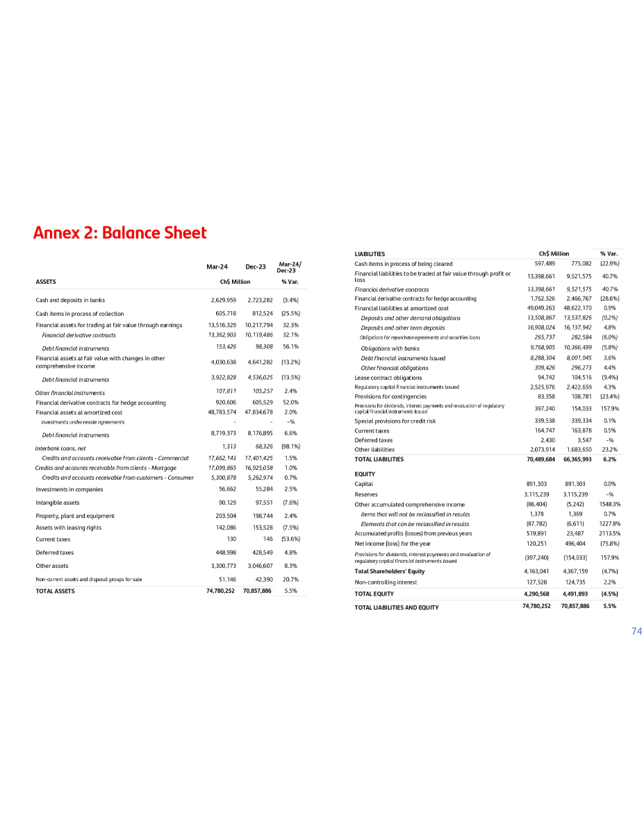 A nn e x 2:B a l a n c e s hee t mar-12月24日-23日a SS e t s c h $ m i ll i o n m a r-24/d e c-23% v a r。(3.4%)2,723,2822,629,959CA s h a n d depo sit s i n ba n ks(25.5%)812,524605,718CA s h it ems i n proce s of collec ti on 32.3% 10,217,79413,516,329以公允价值计量且其变动计入收益的金融资产2.4% 105,257 107,811 Other financial in s truments 52.0% 605,529920,606 F in a n c i al der iv a tiv e co nt rac t s对于h edge acco untin g f i nan c i a l a sse t s a t a m或t i z ed c o s t in v e s t m e n t s u n d e r e e e e e e e e e e e e e e e e e e e e e e e e e e e e e e e e e e e e e e e e e e e e e e e e e e e e e e e e e e e e e e e e e e e e e e e e e e e e e e e e e e e e e e e e e e e e e e e e e e e e e e e e e e e e e e e e e e e e e e e e e e e e e e e e e e e e e e e e e e e e e e e e e176 , 89 5 47 , 834 , 678 2 .0%-–% 6.6%应收客户债权及应收账款-应收客户按揭债权及应收账款-消费者i n v es m e e e e e e e e e e e e e e e e e e e e e e e e e e e e e e e e e e e e e e e e e e e e e e e e e e e e e e e e e e e e e e e e e e e e e e e e e e e e e e e e e e e e e e e e e e e e e e e e e e e e e e e e e e e e e e e e e e e e e e e e e e e e e e e e e e e e e e e e e e e e e e e e e e e e e e e e e e e e e e e e e e e e e e e e974 55 , 284 97 , 551 198 , 744 1.0% 0.7% 2.5% ( 7 .6%)2.4%(7.5%)153,528142,086 ASS E T S WIT H LEA SIN G R I G HT S(53.6%)146130 C U RRE NT T AXES 4.8% 428,549448,998 D EFERRE T AXES 8.3% 3,046,6073,300,773 O th er a SS E T S 20.7% 42,39051,146非流动资产和d出售g组f或出售5.5% 70,857,88674,780,252资产负债总额C H $ M i ll i o n % V a r. l o s s(22.9%)775,082正在清算的现金项目597,48940.7% 9,521,575以公允价值变动计入利润的金融负债或13,398,66140.7% 9,521,575金融衍生工具合约13,398,661(28.6%)2,466,767套期会计金融衍生工具合约1,762,3260.9% 48,622,170以摊余成本计量的金融负债49,049,263(0.2%)13,537,826存款和其他活期债务13,508,8674.8% 16,137,942存款及其他定期存款16,908,024(6.0%)282,584265,73732.1%回购协议义务和证券贷款13,362,90310,119,486份金融D等权合同(5.8%)10,366,4999,768,90556.1%与银行的债权153,42698,308债权金融3.6% 8,001,0458,288,304(13.2%)以公允价值计量且有其他4.4%变动的债权金融资产296,273309,426其他金融obli g ations 4,030,6384,641,282 comre h e nsiv e in come(9.4%)104,51694,742(13.5%)L ea s e co nt ract obl i ga ti o n s 3,922,8284,536,025 debt financial in s truments R e g u l a t ory c a p it a l fi n a n c i a l i n s t r u m en t s i ss ued p ro v i s i o n s f或c o n t i n ge n c i e s股息准备金,利息支付和重估监管c ap i t a l f i nan c i a l i n s t r u m en t s i ss ued s pe c i a l p ro v i s i o n s f or c r ed it r i s k 2,525,97683,358397,240339,5382,422,659108,781154,033339,3344.3%(23。4%)4%)157.9% 0.1% 0.5% 163,878164,747 C u rre n t t axes –% 3,5472,430 D eferred t axes 23.2% 1,683,6502,073,914(98.1%)O th er l i ab i l iti es 1,31368,326同业借款s,净额6.2% 66,365,99370,489,6841.5%负债总额17,662,14317,401,425贷项和应收账款-Commercial Equity Capital R ese r v e s O t h e r a CC u m u l a t ed c o m p r e h e n s i v e i n c o m e i t e m s t h a t w i ll no t b e r e c l a ss i f i e d i n r e s u l t s 891,3033,115,239(86,404)1,378891,3033,115,239(5,242)1,3690.0% –% 1548。3% 0.7% 1227.8%(6,611)(87,782)可在业绩中重新分类的要素2113.5% 23,487519,891 A cumulat e d p r of i ts(lo sses)f r om p re v i ous y e e a r s(75.8%)496,404120,251 net in come(lo ss)for the e year 157.9%(154,033)(397,240)股息拨备,利息支付和revaluation of regula t ory cap it al f i nanc i al i n st rumen t s es ed(4.7%)4,367,1594,163,041合计S h a reh old er s'eq u ity 2.2% 124,735127,528 No n-co nt roll in g int ere s t(4.5%)4,491,8934,290,568权益总额5.5% 70,857,88674,780,252负债总额A n d权益74