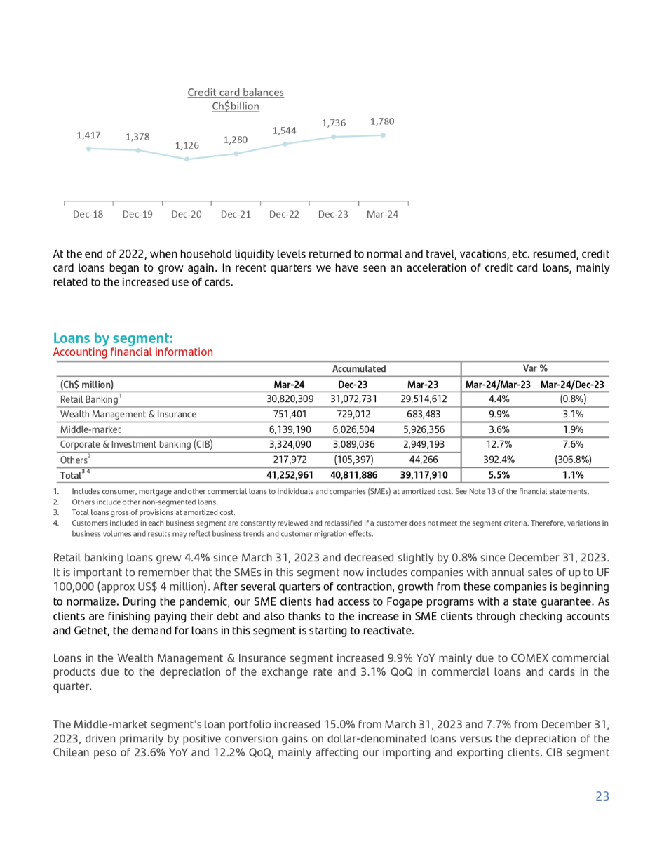 信用卡余额十亿瑞士法郎231,4171,3781,1261,1281,2801,5441,7361,7802022年12月18日-12月19日-12月20日-12月21日-12月22日-3月23日-3月24日2022年底,当家庭流动性水平恢复正常,旅行、度假等恢复时,信用卡贷款又开始增长。最近几个季度,我们看到信用卡贷款加速,这主要与信用卡使用量增加有关。L oa n s b y s e g m e nt:a CC o un ti ng f i n a n c i a l i n f或m a ti o n var %累计3月-3月24日-3月23日-12月24日-12月23日-3月23日-3月24日(百万瑞士法郎)(0.8%)4.4% 29,514,61231,072,73130,820,309零售银行g 13.1% 9.9% 683,483729,012751,401财富管理和保险1.9% 3.6% 5,926,3566,026,5046,139,190中间市场7.6% 12.7% 2,949,1933,089,0363,324,090企业和投资银行(CIB)(306.8%)392.4% 44,266(105,397)217,972其他21.1% 5.5% 39,117,91040,811,88641,252,961总34 1。包括以摊余成本向个人和公司(中小企业)提供的消费、抵押和其他商业贷款。见财务报表附注13。2.O t h e rs i n c l u de o t h e r n n-seg m e n t ed l o an s。3.T o t a l l o an s g ro s o f p ro v i s i o n s a t a m or t i z ed c o s t。4.如果客户不符合分部标准,则每个业务分部中包含的客户将不断进行审查和重新分类。因此,业务量和结果的差异可能反映了业务趋势和客户迁移效应。零售银行贷款增长4。自2023年3月31日以来下降4%,小幅下降0。自2023年12月31日以来8%。重要的是要记住,这一细分领域的中小企业现在包括年销售额高达UF 100,000(约合400万美元)的公司。在经历了几个季度的收缩之后,这些公司的增长开始正常化。在大流行期间,我们的中小企业客户可以使用国家担保的Fogape程序。随着客户正在完成偿还债务,也得益于通过支票账户和Getnet增加的中小企业客户,这一领域的贷款需求开始重新激活。财富管理和保险部门的贷款增加9。同比9%主要由于COMEX商业产品因汇率贬值和3。本季度商业贷款和信用卡环比增长1%。中间市场部分的贷款组合增加15。2023年3月31日及7日起为0%。自2023年12月31日起上涨7%,主要受美元计价贷款的正转换收益推动,而智利比索贬值23。同比增长6%,为12。环比2%,主要影响我们的进出口客户。CIB板块