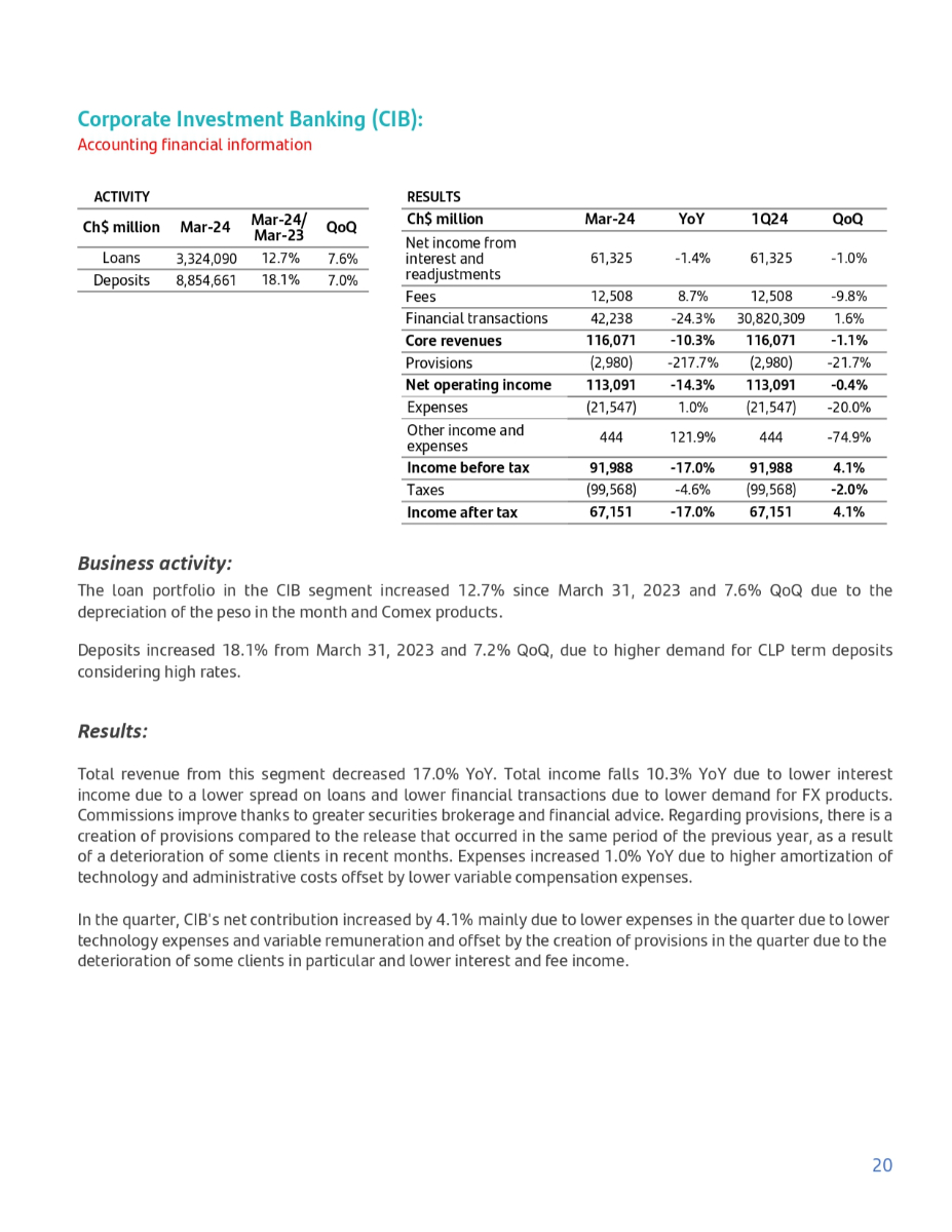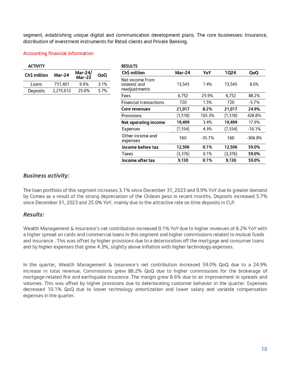 M a r-24/mar-23 C h $ m i ll i o n m a r-24 Q o Q l o a n s 751,4019。9 % 3 .1%存款2,215,61225.0% 5.7%段,建立独特的数字和通信发展计划。核心业务:保险、零售客户投资工具分销及私人银行业务。A CC o un ti ng f i n a n c i a l i n f or m a ti o n activity results e x pen s e s QoQ 1Q24 YoY CH $百万MAR-24 8.6% 13,5451.4% Net income from interest and 13,545 readjustments 88.2% 6,75225.9% fees 6,752-5.7% 7201.5% financial transactions 72024.9% 21,0178.2% core revenues 21,017428.8%(1,518)165.3% provisions(1,518)17.9% 19,4993.4% Net operating income 19,499-10.1%(7,554)4.3% expenses(7,554)-306.8% 560-35.7% Other income及56059.0% 12,5060.1%税前收入12,50659.0%(3,376)0.1%税前收入(3,376)59.0% 9,1300.1%税后收入9,130业务活动:该分部的贷款组合增加3。自2023年12月31日和9日以来的1%。同比9%,因近几个月智利比索强劲贬值导致商品交易所需求增加。存款增加5。自2023年12月31日和25日以来的7%。同比0%,主要由于中电定期存款利率具有吸引力。业绩:财富管理和保险的净贡献同比增长0.1%,原因是收入同比增长8.2%,该细分领域的卡和商业贷款利差较高,以及与共同基金和保险相关的佣金较高。这被抵押贷款和消费者贷款恶化导致的更高拨备以及更高的费用增长4.3%所抵消,略高于通胀和更高的技术费用。本季度,Wealth Management & Insurance的净贡献增加了59。环比下降0%,原因是24。总收入增长9%。佣金增长88。环比增长2%,原因是抵押贷款相关火灾和地震保险的经纪佣金增加。利润率增长8。6%,原因是价差和交易量有所改善。这被本季度客户行为恶化导致的更高拨备所抵消。支出减少10。环比下降1%,原因是本季度技术摊销减少以及工资和可变薪酬支出减少。18