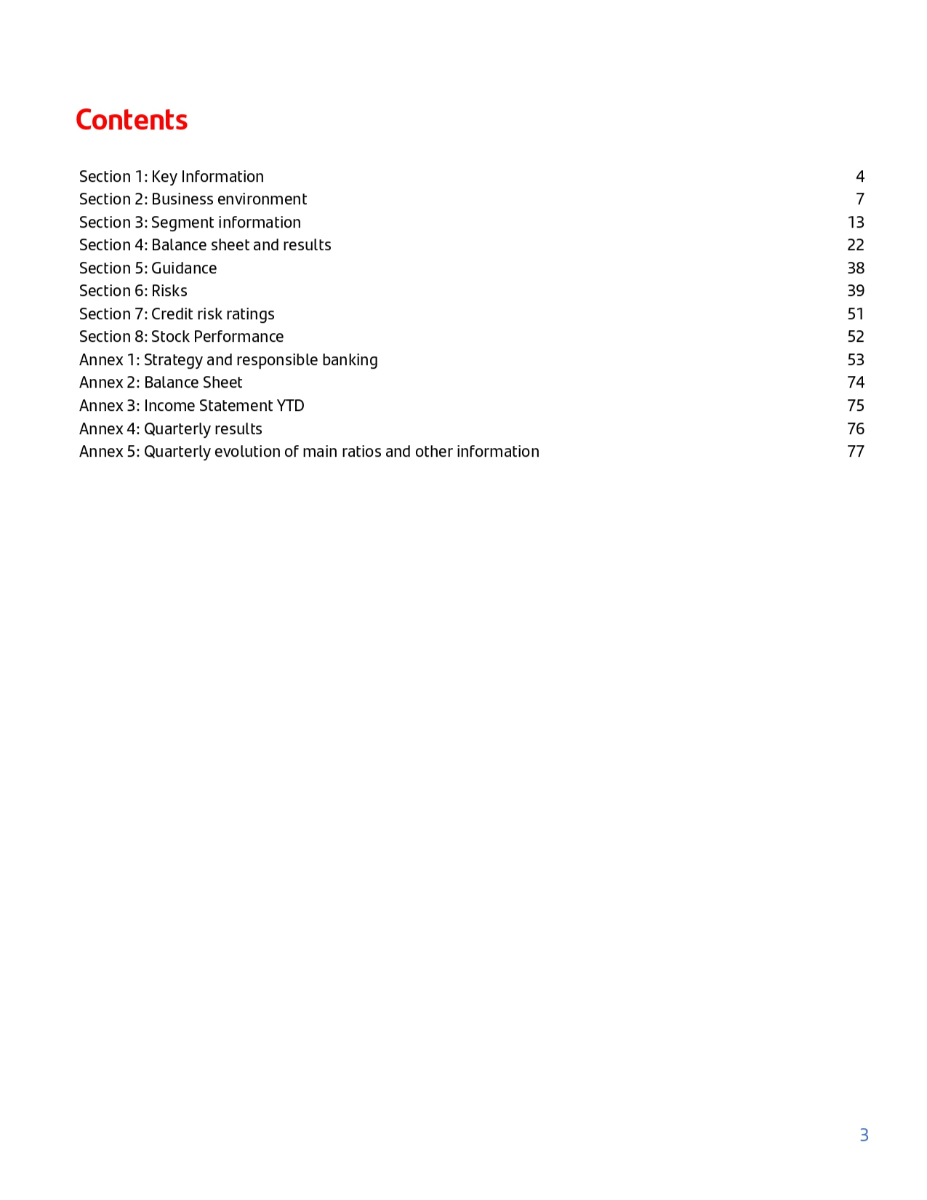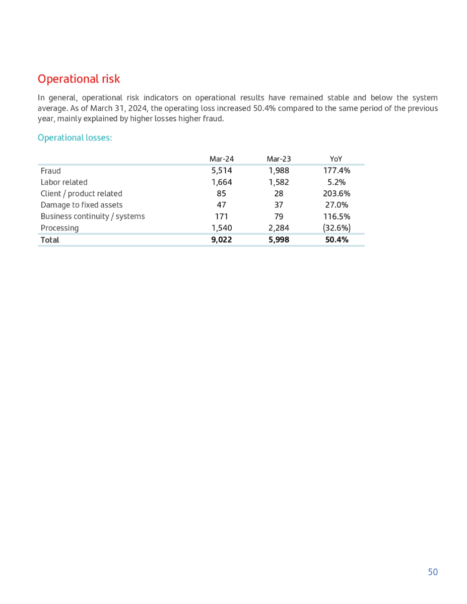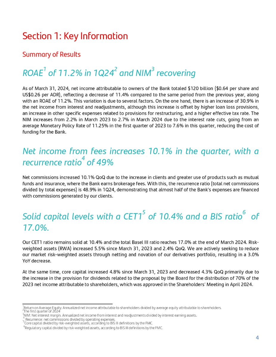 S e c ti o n 1:k e y i n f o r m a ti o n s u mm a r y o f r e s u l t s r o a e 1 o f 11。2% i n 1 q24 2 a n d n i m 3 r e c o v e r i n g截至2024年3月31日,归属于该行所有者的净利润总计1200亿美元(0美元。每股64美元和0美元。每份ADR 26份),反映减少11份。与上年同期相比为4%,ROAE11。2 % .这种差异是由几个因素造成的。一方面,增加了30个。9%的净收益来自利息和调整,尽管这一增长被更高的贷款损失准备金、与重组准备金相关的其他特定费用增加以及更高的有效税率所抵消。净息差从2。2023年3月的2%至2。2024年3月因降息而下降7%,从平均货币政策利率11。2023年第一季度增长25%至7。本季度的6%,降低了银行的融资成本。本季度手续费净收入增长10.1%,同比增长49%净佣金增长10。环比增长1%,原因是客户增加,以及更多地使用共同基金和保险等产品,银行在这些领域赚取经纪费。这样,重复比率(总净佣金除以总费用)为48。24年第一季度9%,这表明该行几乎一半的开支都是由我们的客户产生的佣金提供的。S o l i d c a p i t a l l e v e l s w i t h a c e t 15 o f 10。4% A n d a b i s r a t i o 6 o f 17.0%。我们的CET 1的比率仍然稳定在10。4%,巴塞尔III总比率达到17。2024年3月底为0%。风险加权资产(RWA)增加5。自2023年3月31日以来的5%和2。环比4%。我们正在积极寻求通过净额结算和更新我们的衍生品投资组合来降低我们的市场风险加权资产,从而导致3。同比下降0%。同时,核心资本增加4。自2023年3月31日以来下跌8%,跌幅4。环比3%主要是由于董事会提议分配2023年归属于股东的净利润的70%相关的股息拨备增加,该提议已在2024年4月的股东大会上获得批准。1平均股本回报率。归属于股东的年化净利润除以归属于股东的平均权益。2 T H E F I R S T Q U A R T E R O F 2024 3 NIM:净息差。年化利息和调整净收益除以生息资产。。4经常性:净佣金除以运营费用。5核心资本除以风险加权资产,根据BIS III定义由FMC提供。6监管资本除以风险加权资产,根据BIS III定义由FMC提供。4