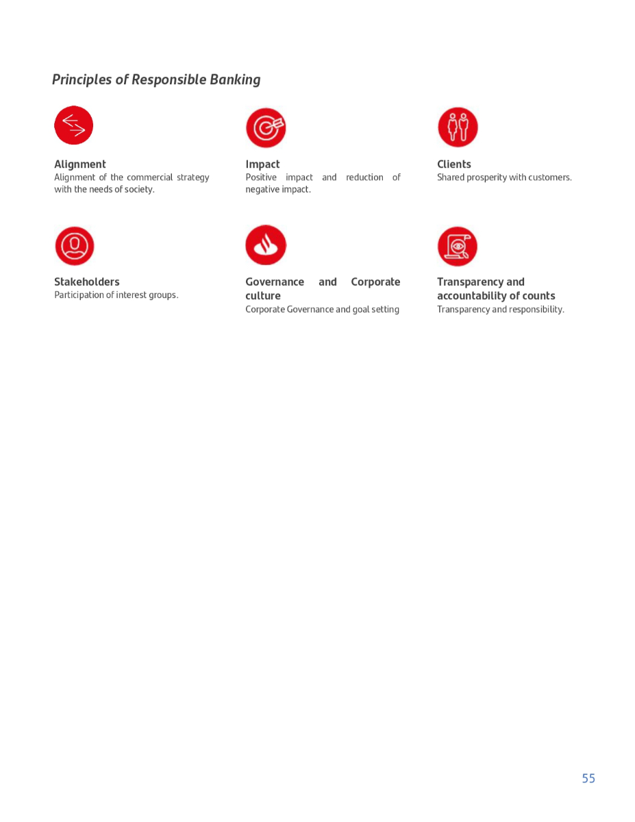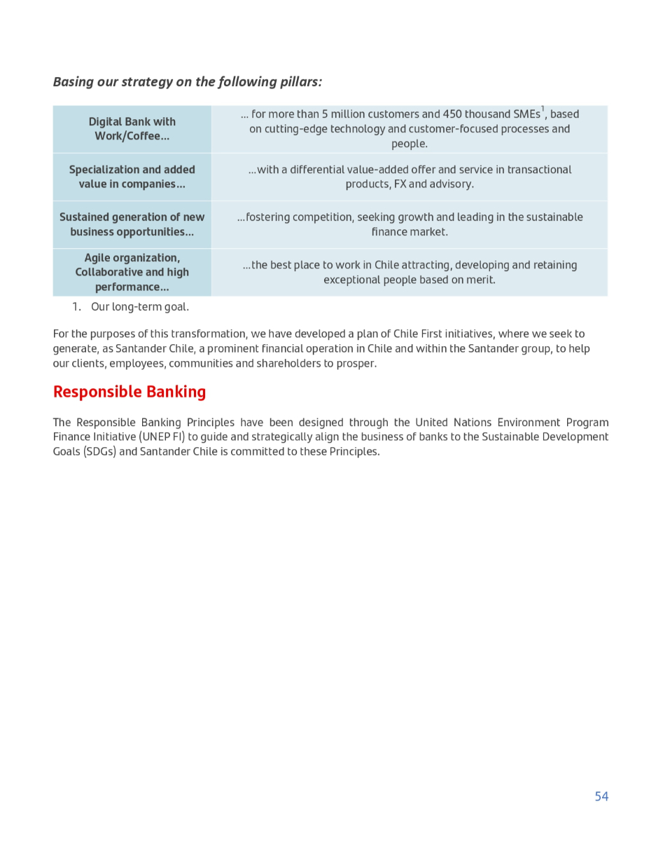 54我们的战略基于以下支柱:…为超过500万客户和45万中小企业1,基于尖端技术和以客户为中心的流程和人员。提供工作/咖啡的数字银行……在交易产品、外汇和咨询方面提供差别增值优惠和服务。公司中的专业化和附加值……在可持续金融市场中培育竞争、寻求增长和领先。持续产生新商机……智利最好的工作场所,以功绩吸引、发展和留住优秀人才。敏捷组织,协同高效…1。Ou r l o ng-t e r m g o a l。为了这一转变的目的,我们制定了智利优先倡议的计划,我们寻求在其中产生作为智利桑坦德银行和桑坦德集团内部的一家著名金融机构的智利,以帮助我们的客户、员工、社区和股东实现繁荣。R e s p o n s i b l e b a n k in g负责任的银行原则是通过联合国环境规划署融资倡议(UNEP FI)设计的,旨在指导银行业务并使其在战略上与可持续发展目标(SDG)保持一致,智利桑坦德银行致力于这些原则。