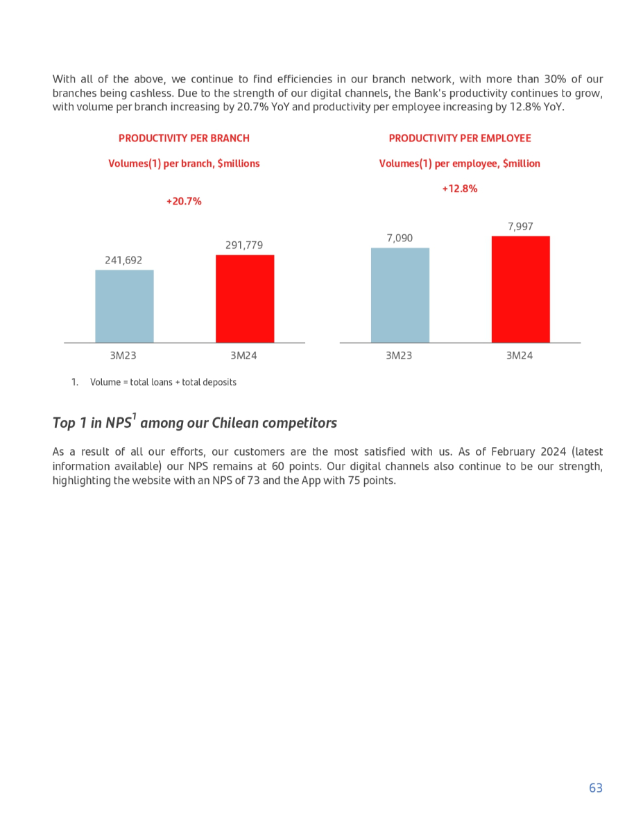 有了以上这些,我们继续在我们的分行网络中找到效率,我们超过30%的分行是无现金的。由于我们数字渠道的实力,银行的生产力持续增长,每个分行的业务量增加了20。同比增长7%,员工人均生产率增长12。同比8%。P R O D U C T I V I T Y P E R B R A N C H V o l u m e s(1)p e r b r a n c h,$ m i ll i o n s + 20。7% 241、692291、7793米233米241。V o l u m e = t o t a l l o a n s + t o t a l dep o s it s p r o d u c t i v i t y p r e r e m p p p p p p p p p p p p p p p p p p p p p p p p p p p p p p p p p p p p p p p p p p p p p p p p p p p p p p p p p p p p p p p p p p p p p p p p p p p p p p p p p p p p p p p p p p p p p p p p p p p p p9973 m 233 m 24 t o p 1 i n n n p s 1 a m o n g o u r c h i l e a n c o m p e t i t o r s由于我们所有的努力,我们的客户对我们是最满意的。截至2024年2月(可获得最新信息),我们的NPS维持在60点。我们的数字渠道也继续成为我们的强项,突出了NPS为73分的网站和75分的App。