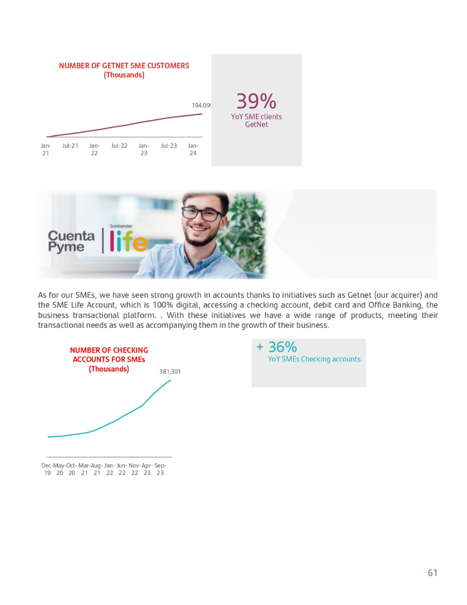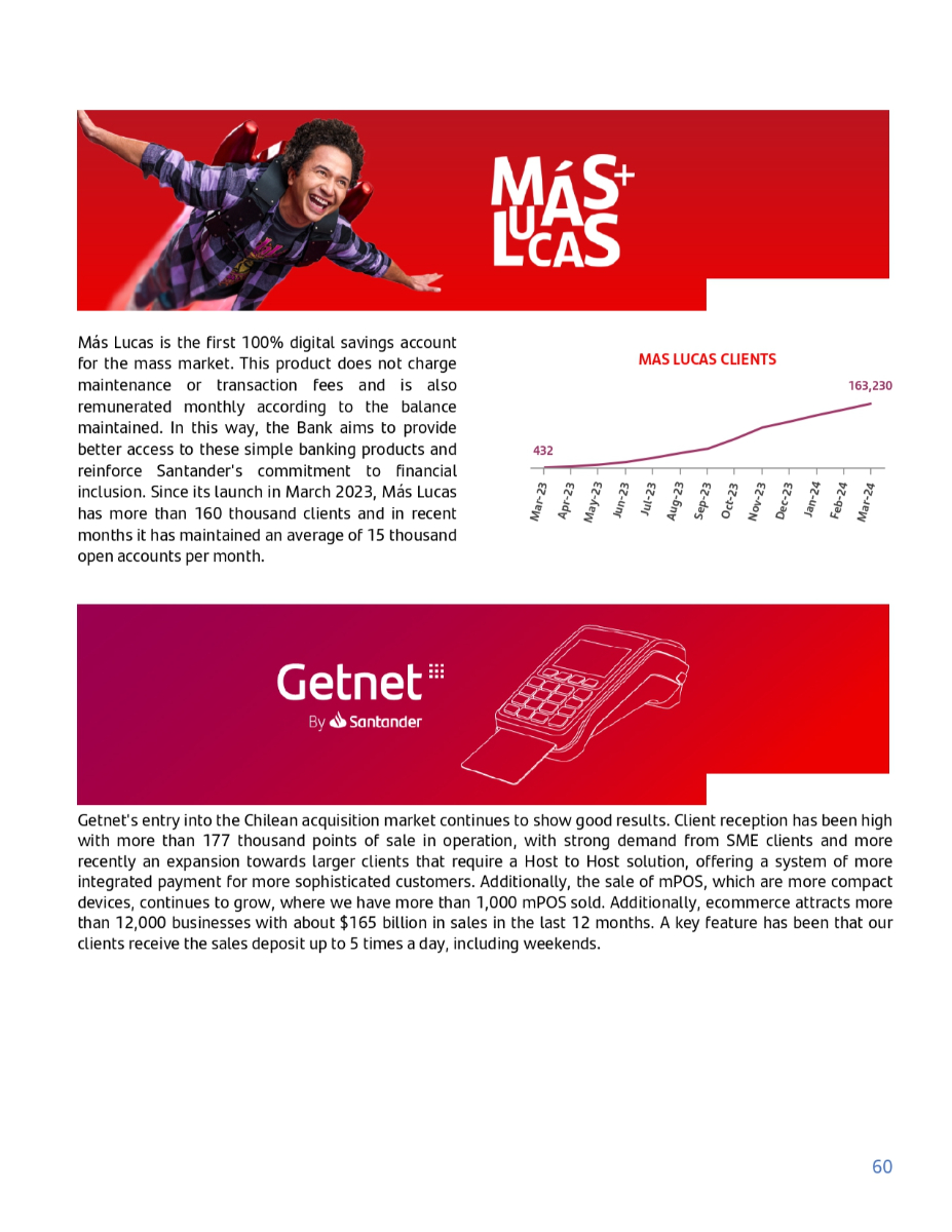 M á s Lucas是第一个面向大众市场的100%数字储蓄账户。这款产品不收取维护费、交易费,也是按维护的余额按月支付报酬。通过这种方式,该行旨在为这些简单的银行产品提供更好的渠道,并加强桑坦德银行对金融i n c l u s i o n的承诺。S i n c e it s l a un c h i n m a r c h 2023,M á s l u c a s有超过16万个客户端,最近m o n t h s it h a s m a i n t a i n e d a n a v e r a g e o f 15 t h o u s a n d o p e n a c o un t s p e r m o n t h。M A S L U C A S C L I E N T S 432163,230 Getnet进军智利收购市场继续展现良好成绩。客户接待量一直很高,已有超过17.7万个销售点投入运营,中小企业客户的需求强劲,最近向需要主机到主机解决方案的更大客户扩展,为更成熟的客户提供更集成的支付系统。此外,mPOS,也就是更紧凑的设备,销售继续增长,我们在那里销售了超过1,000个mPOS。此外,电子商务在过去12个月吸引了超过12000家企业,销售额约为1650亿美元。一个关键的特点是,我们的客户每天最多收到5次销售定金,包括周末。60