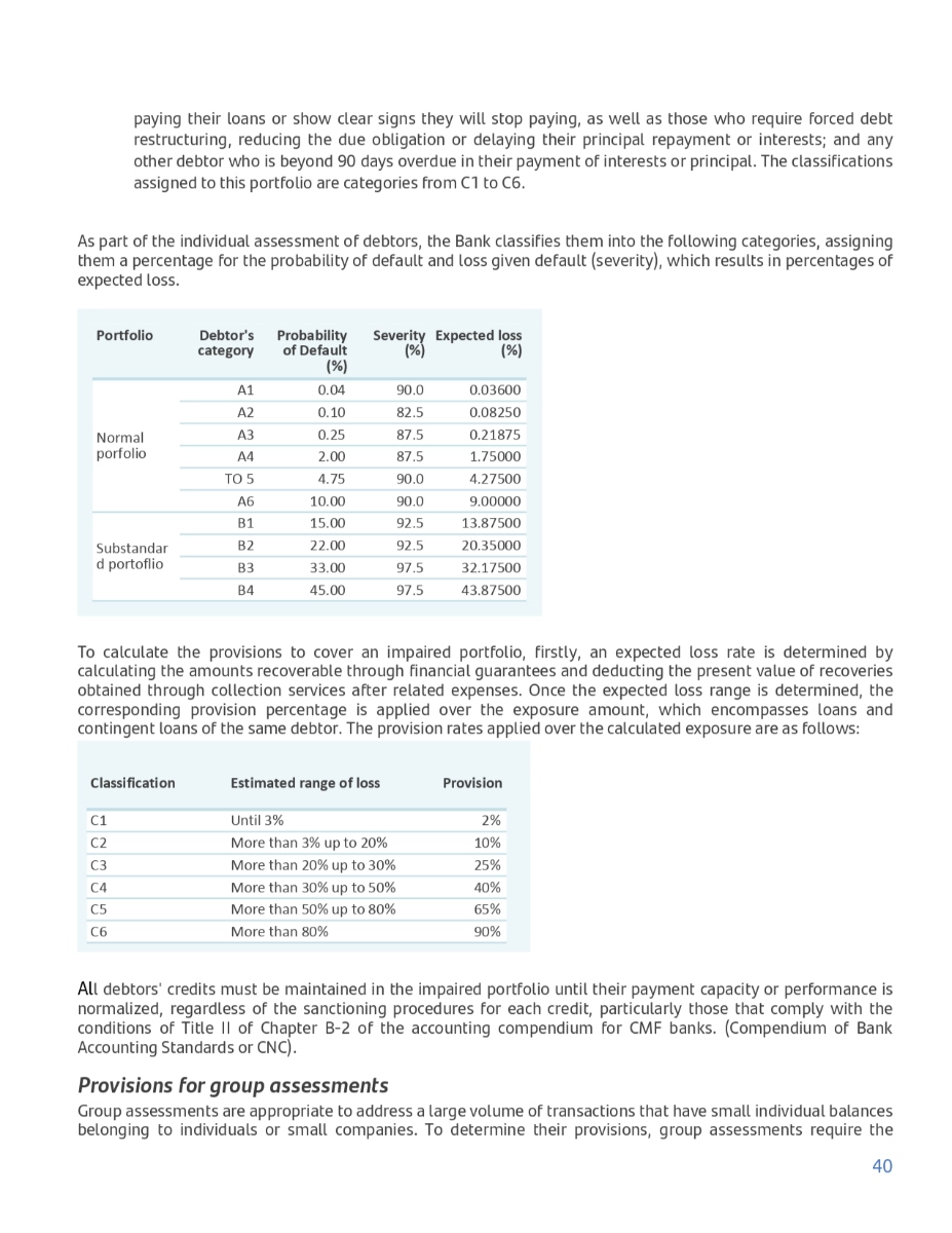 40支付其贷款或显示其将停止支付的明确迹象,以及要求强制债务重组、减少到期债务或延迟偿还其本金或利息的人;以及任何其他逾期超过90天的债务人支付其利息或本金的人。分配给这个投资组合的分类是从C1到C6的类别。作为对债务人的个别评估的一部分,银行将他们分为以下几类,为他们指定违约概率和给定违约(严重程度)损失的百分比,从而得出预期损失的百分比。严重性预期损失(%)(%)Probabilit y o f Defaul t(%)债务人类别y Portfolio 0.03 60090.0 0.04 A1 0.08 2508 2.5 0.10 A2 0.2187587.5 0.25 A3 Normal porfolio 1.7500087.5 2.00 A4 4.2750090.04.75至59.0000090.10 10.00 A6 13.8750092.5 15.00 B1 20.3500092.52 2.00 B2 Substandard d portoflio 32.17 50097.53 3.00 B3 43.87 50097.54 5.00 B4计算拨备以覆盖减值组合,首先,预期损失率通过计算通过财务担保可收回的金额,扣除相关费用后通过收款服务获得的回收现值确定。一旦确定了预期损失范围,就会在敞口金额上应用相应的拨备百分比,敞口金额包括同一债务人的贷款和或有贷款。在计算的风险敞口之上适用的拨备率如下:拨备估计损失分类范围2%至3% C1 10%以上3%至20% C2 25%以上20%至30% C3 40%以上30%至50% C4 65%以上50%至80% C5 90%以上C6 Al l债务人的债权必须在减值组合中保持到其支付能力或履约能力正常化,无论每笔债权的制裁程序如何,特别是那些符合《CMF银行会计汇编》第B-2章第二编条件的。(银行会计准则简编或CNC)。P r o v i s i o n s f o r g r o u p a ss e ss m e n t s集团评估适用于处理属于个人或小公司的个人余额较小的大量交易。为确定其规定,团体评估要求