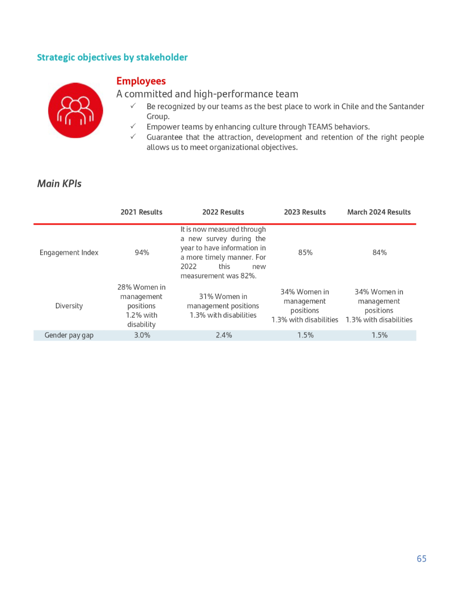 利益相关者员工的战略目标A c o mmi tt e d a nd h i gh-p e r f o r m a n c e t e a m被我们的团队公认为智利和桑坦德集团的最佳工作场所。E m p o w e r t e a m s by e nh a n c i ng c u l t u r e t h ro ugh t e a m s b e h a v i ors。保证吸引、发展和留住合适的人,让我们达到组织目标。M a i n k p i s 651.5% 1.5% 2.4% 3.0%性别薪酬差距2024年3月结果2023年结果2022年结果2021年结果84% 85%现在通过年内的新调查来衡量,以便更及时地获得信息。对于2022年,这一新的衡量标准为82%。94%参与指数D i v e r s it y 28% w o m en i n管理职位1。2% w it h残疾31% w o m en i n m a n a g m en t p o s iti o n s 1。3% w it h d i s a b i l iti e s 34% w o m en i n management 34% w o m en i n management positions 1.3% with disabilities 1.3% with disabilities