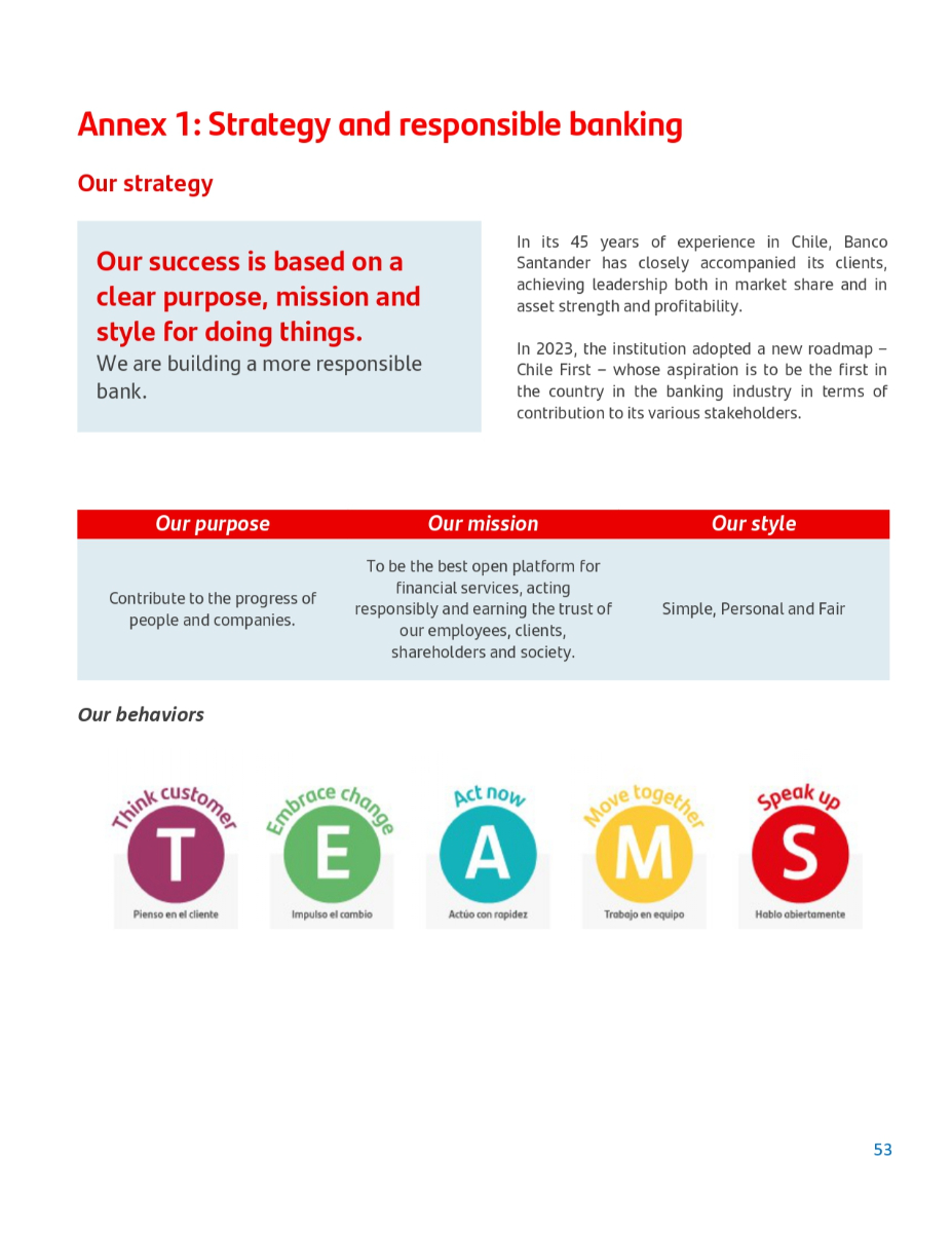 A NN E X1:S T R A T E G Y A N D R E S P O N S I B L E B A N K I N G O U R S T R A T E G Y凭借在智利45年的经验,桑坦德银行与客户密切相伴,在市场份额和A S S E T S T R E NG T H A ND P O F IT A B I L IT Y方面均实现了领先。2023年,该机构通过了一份新的路线图——智利优先——其志向是在银行业中成为该国第一个在c o n t r i bu ti o n t o it s v a r i o u s t a k e h o l d e r方面的企业。O u r s u c c e ss i s b a s e d o n a c l e a r p u r p o s e,m i ss i o n a n d s t y l e f o r d o i n g thi n g s。W e a r e bu i l d i ng a m o r e r e s p o n s i b l e bank。我们的风格我们的使命我们的宗旨是成为为RESP O金融服务进步做出贡献的最佳开放平台,代理ST的简单、个人和公平的人和公司。nsibly并赚取tru我们的员工、客户、股东和社会。我们的行为53