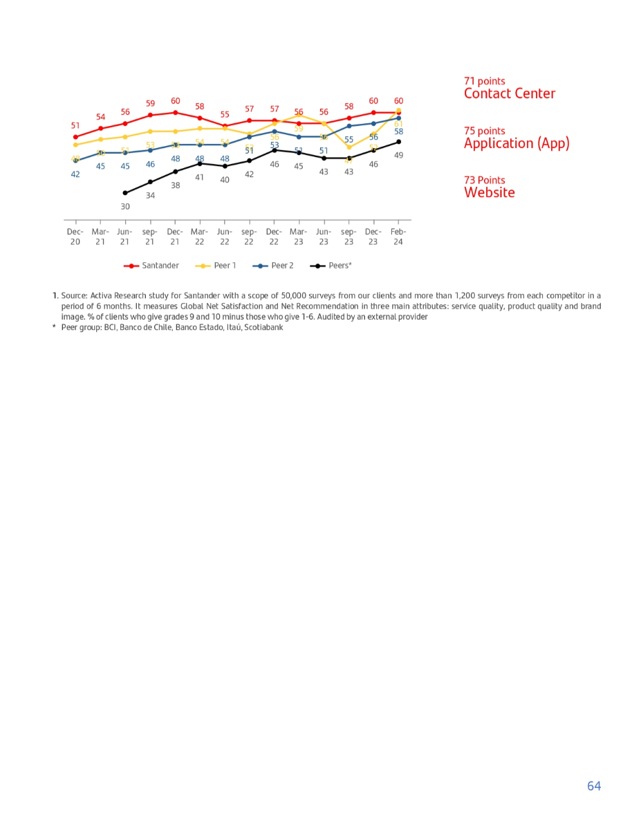 515456596058555757586060566148425051454553465834385354544848484140512425346565956515145435547435652464930 Dec-Mar-Jun-Sep-Dec-Mar-Jun-Sep-Dec-Feb-20212121212122222222222232323232324 Santander P ee r1 p ee r 2 p ee r s * 6471 p o i n t s c o n t a c t c e n t e r 75 p o i n t s a pp l i c a t i o n(a pp)73 p o i n t s w e b s i t e 1。资料来源:Activa Research为Santander进行的研究,范围为来自我们客户的50,000次调查,以及来自每个竞争对手的1,200多次调查,为期6个月。它在服务质量、产品质量和品牌形象三个主要属性上衡量全球净满意度和净推荐度。给予9级和10级的客户减去给予1-6级的客户的百分比。由外部提供商*同行集团审计:BCI、智利银行、美国国家银行、Ita ú、加拿大丰业银行