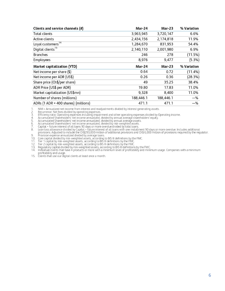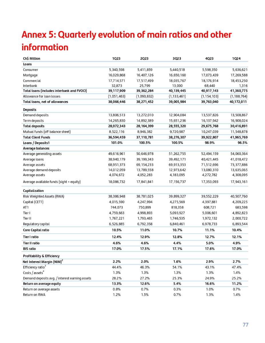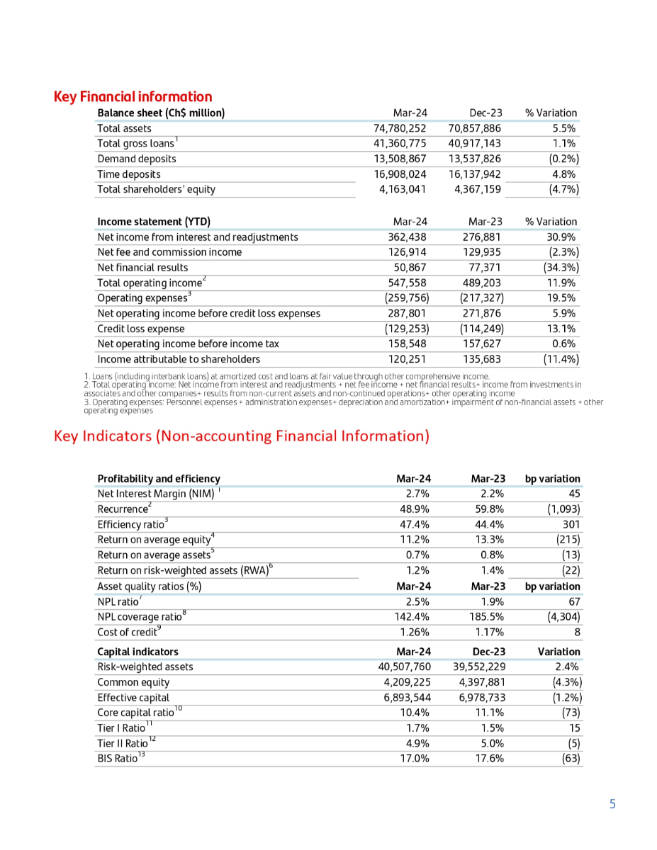 K E Y F in a n c i a l in a fo r m a t i o n % Variation Dec-23 Mar-24 Balance sheet(CH $ million)5.5% 70,857,88674,780,252 Total assets 1.1% 40,917,14341,360,775 Total gross loans 1(0.2%)13,537,82613,508,867活期存款4.8% 16,137,94216,908,024定期存款(4.7%)4,367,1594,163,041 Total shareholders ' equity % Variation Mar-23 Mar-24 Income statement(YTD)30.9% 276,881362,438 Net income from interest and readjustments(及佣金收入(34.3%)77,37150,867净财务业绩11.9% 489,203547,558营业总收入219.5%(217,327)(259,756)营业费用35.9% 271,876287,801扣除信用损失费用前的营业收入净额13.1%(114,249)(129,253)信用损失费用0.6% 157,627158,548税前净营业收入(11.4%)135,683120,251归属于股东的收益1。以摊余成本计量的贷款(包括同业借款)和以公允价值计量且其变动计入其他综合收益的贷款。2.营业总收入:利息及调整净收入+手续费净收入+财务业绩净额+对联营公司及其他公司投资收益+非流动资产及非持续经营业绩+其他营业收入3。营业费用:人员费用+管理费用+折旧摊销+非金融资产减值+其他o p e r a ti n g e x p e n s e s关键指标(非会计财务信息)盈利能力和效率N e t i n t e r e s t m a r g i n(n i m)1 m a r-24 2.7% m a r-23 2.2% bp v a r i a ti o n 45递归2 e ff i c i en c y r a ti o 348。9 % 47 .4 % 59 .8 % 44 .4 % ( 1 , 093 ) 301 13 .3%(215)R e t u r n o n a v e r a ge equ it y 4 r e t u r n n a v e r a ge a ss e t s 511。2 % 0 .7 % 0 .8 % ( 13 ) 1 .4%(22)R e t u r n o n r i sk-w e i gh t ed a ss e t s(r w a)6 a ss e t qu a l it y r a ti o s(%)1.2% m a r-24 2.5% m a r-23 1.9% bp v a r i a ti o n 67 NP l r a ti o 7 NP l c o v e r a ge r a ti o 8 c o s to f c r ed it 9142。4 % 1 .26 % 185 .5 % 1 .17%(4,304)8 C a p it a l in d i c a t o r s r i sk-w e i gh t ed a ss e t s m a r-24 40,507,760 d e c-23 39,552,229变动2.4% c o mm o n equ it y e ff e c ti v e c a p it a l 4,209,2256,893,5444,397,8816,978,733(4。3 % ) ( 1 .2%)C或e c a p it a l r a ti o 10 t i e r i r i r a ti o 1110。4 % 1 .7 % 11 .1 % 1 .5%(73)15 T i e r II R a ti o 12 b i s r a ti o 134。9 % 17 .0 % 5 .0 % 17 .6 % ( 5 ) ( 63 ) 5