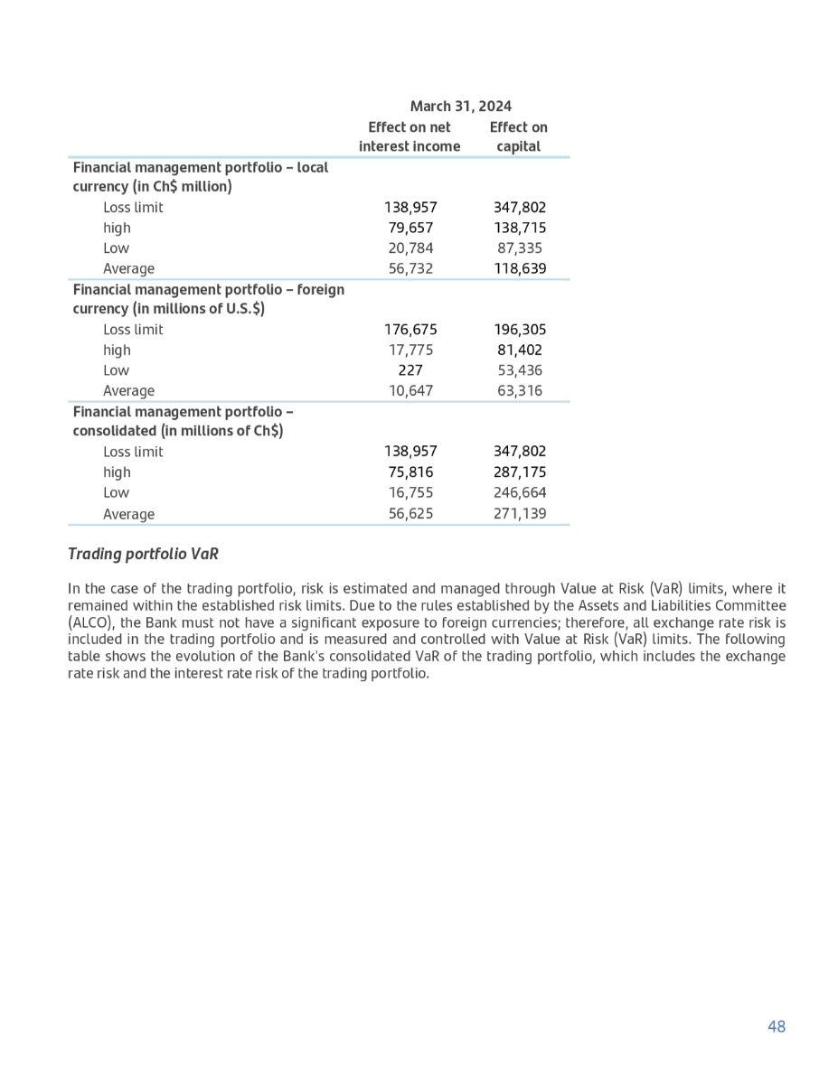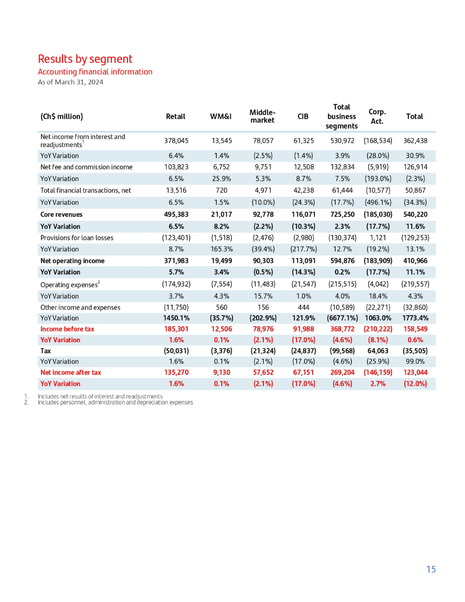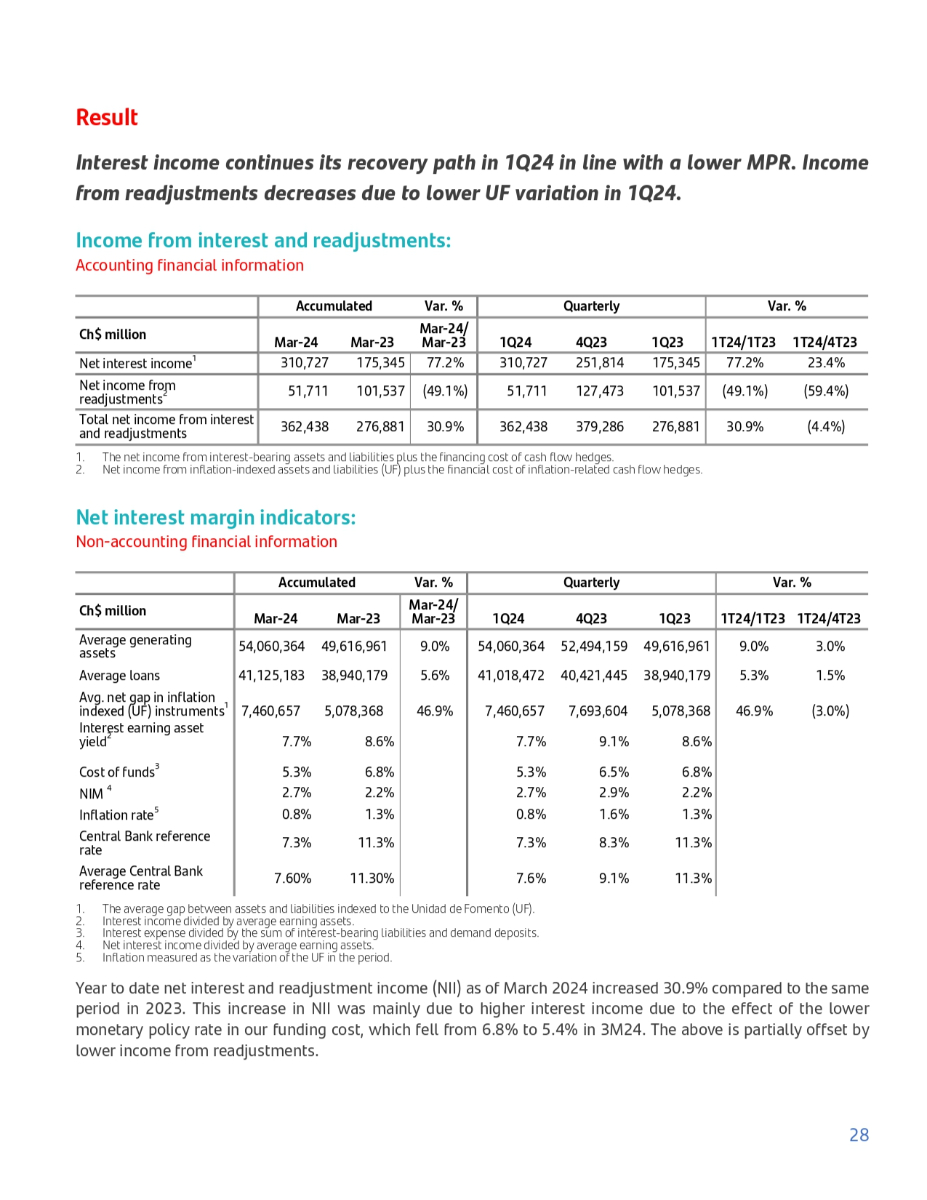 K E Y F in a n c i a l in a fo r m a t i o n % Variation Dec-23 Mar-24 Balance sheet(CH $ million)5.5% 70,857,88674,780,252 Total assets 1.1% 40,917,14341,360,775 Total gross loans 1(0.2%)13,537,82613,508,867活期存款4.8% 16,137,94216,908,024定期存款(4.7%)4,367,1594,163,041 Total shareholders ' equity % Variation Mar-23 Mar-24 Income statement(YTD)30.9% 276,881362,438 Net income from interest and readjustments(及佣金收入(34.3%)77,37150,867净财务业绩11.9% 489,203547,558营业总收入219.5%(217,327)(259,756)营业费用35.9% 271,876287,801扣除信用损失费用前的营业收入净额13.1%(114,249)(129,253)信用损失费用0.6% 157,627158,548税前净营业收入(11.4%)135,683120,251归属于股东的收益1。以摊余成本计量的贷款(包括同业借款)和以公允价值计量且其变动计入其他综合收益的贷款。2.营业总收入:利息及调整净收入+手续费净收入+财务业绩净额+对联营公司及其他公司投资收益+非流动资产及非持续经营业绩+其他营业收入3。营业费用:人员费用+管理费用+折旧摊销+非金融资产减值+其他o p e r a ti n g e x p e n s e s关键指标(非会计财务信息)盈利能力和效率N e t i n t e r e s t m a r g i n(n i m)1 m a r-24 2.7% m a r-23 2.2% bp v a r i a ti o n 45递归2 e ff i c i en c y r a ti o 348。9 % 47 .4 % 59 .8 % 44 .4 % ( 1 , 093 ) 301 13 .3%(215)R e t u r n o n a v e r a ge equ it y 4 r e t u r n n a v e r a ge a ss e t s 511。2 % 0 .7 % 0 .8 % ( 13 ) 1 .4%(22)R e t u r n o n r i sk-w e i gh t ed a ss e t s(r w a)6 a ss e t qu a l it y r a ti o s(%)1.2% m a r-24 2.5% m a r-23 1.9% bp v a r i a ti o n 67 NP l r a ti o 7 NP l c o v e r a ge r a ti o 8 c o s to f c r ed it 9142。4 % 1 .26 % 185 .5 % 1 .17%(4,304)8 C a p it a l in d i c a t o r s r i sk-w e i gh t ed a ss e t s m a r-24 40,507,760 d e c-23 39,552,229变动2.4% c o mm o n equ it y e ff e c ti v e c a p it a l 4,209,2256,893,5444,397,8816,978,733(4。3 % ) ( 1 .2%)C或e c a p it a l r a ti o 10 t i e r i r i r a ti o 1110。4 % 1 .7 % 11 .1 % 1 .5%(73)15 T i e r II R a ti o 12 b i s r a ti o 134。9 % 17 .0 % 5 .0 % 17 .6 % ( 5 ) ( 63 ) 5
