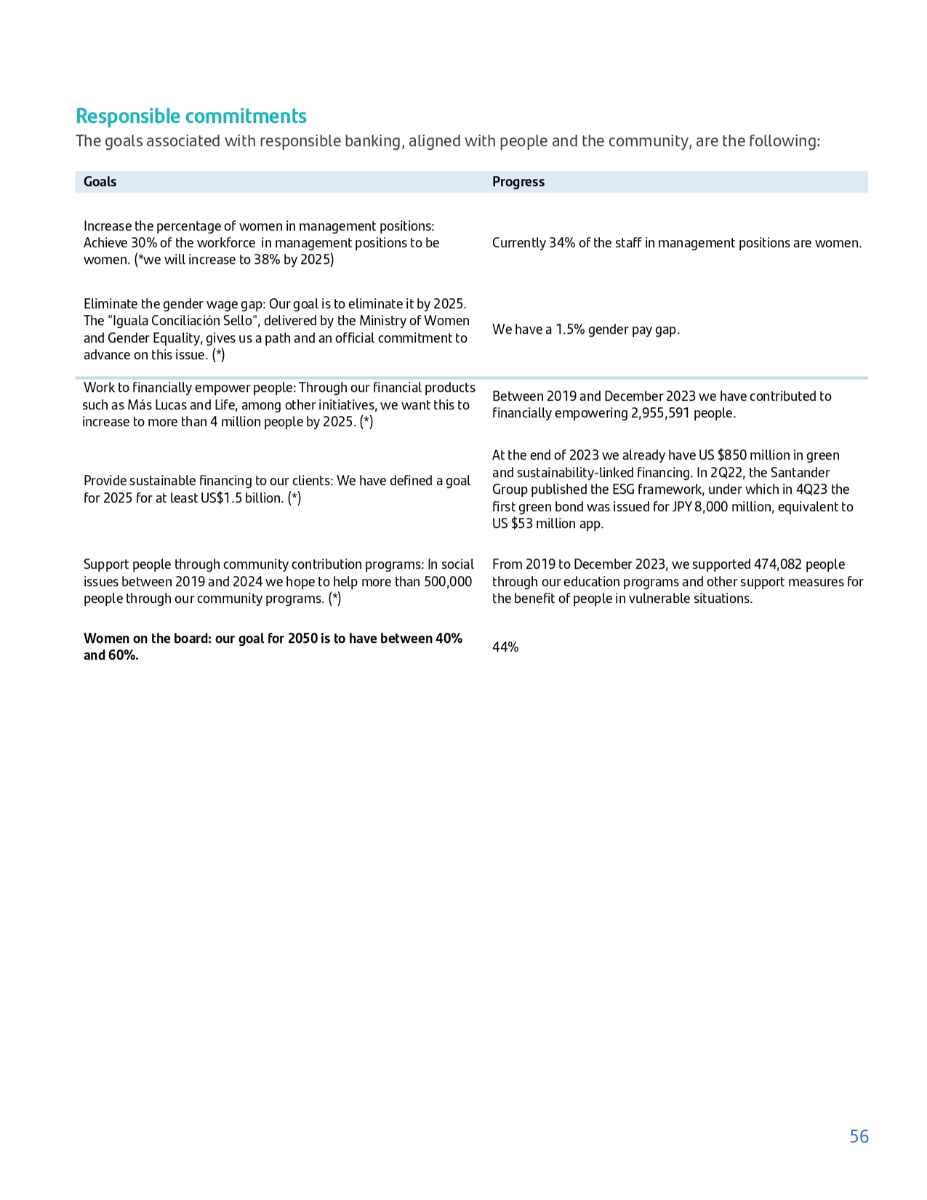 R e s p o n s i b l e c omm i t m e n t s与负责任的银行业务相关的目标,与人和社区保持一致,如下:目标进展提高女性在管理职位的百分比:实现管理职位中30%的劳动力为w o m e n。(* W e w i ll i n c r e a s e t o到2025年38%)目前管理岗位上34%的工作人员是女性。消除性别工资差距:我们的目标是到2025年消除它。由妇女和性别平等部提供的“Iguala Conciliaci ó n Sello”为我们提供了一条道路,并为我们在t h i s i ss u e上的a d v a n c e提供了官方承诺。(*)W e h a v e a 1。5% ge n de r p a y g a p。致力于为人们提供金融赋权:通过我们的金融产品,例如M á s Lucas和Life,以及其他举措,我们希望到2025年这一数字增加到超过400万人。(*)B e t w ee n 2019 a n d d d e c e m be r 2023 w e h a v e c on t r i b u t ed t o财政赋权2,955,591人。为我们的客户提供可持续融资:我们已经定义了一个目标f o r 2025 f o r a t l e a s t 1美元。5 b i ll i on。(*)截至2023年底,我们已经拥有8.5亿美元的绿色和可持续发展相关融资。2Q22,Santander Group发布了ESG框架,根据该框架,在4Q23,the f i rs t g r ee n b on d w a s i ss u ed f o r j p y8,000 mi ll i on,eq u i v a l e n t o US $ 53 mi ll i on a pp。通过社区贡献计划支持人们:在2019年至2024年的社会问题上,我们希望通过我们的社区计划帮助超过500,000人。(*)从2019年至2023年12月,我们通过教育计划和其他支持措施支持了474,082人,用于t h e be n e f it o f pe o p l e i n v u l n e r a b l e s it u a ti on s。董事会中的女性:我们2050年的目标是拥有40%到60%之间。44 % 56