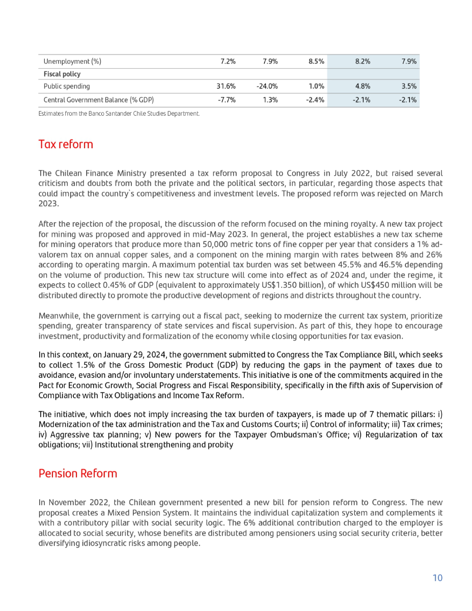 107.9% 8.2% 8.5% 7.9% 7.2%失业率(%)财政政策3.5% 4.8% 1.0%-24.0% 31.6%公共支出-2.1%-2.1%-2.4% 1.3%-7.7%中央政府余额(% GDP)来自桑坦德银行智利研究部的估计。智利财政部于2022年7月向国会提交了一份税收改革提案,但提出了来自私营部门和政治部门的一些批评和质疑,特别是那些可能影响该国竞争力和投资水平的方面。提议的改革于2023年3月被否决。在提案被否决后,改革的讨论集中在采矿特许权使用费上。2023年5月中旬提出并批准了新的矿业税收项目。总体而言,该项目为每年生产超过50,000公吨精细铜的采矿运营商建立了一个新的税收计划,该计划考虑对年度铜销售征收1%的从价税,并根据运营利润率对采矿利润率征收8%至26%的税率。最高潜在税负设定在45之间。5%和46。5%,视产量而定。这一新的税收结构将于2024年生效,在该制度下,它预计收缴0。GDP的45%(相当于约1美元。3500亿),其中4.5亿美元直接发放,用于促进全国各地区、区的生产性发展。与此同时,政府正在执行一项财政协议,寻求使当前的税收制度现代化,优先考虑支出,提高国家服务和财政监管的透明度。作为其中的一部分,他们希望在关闭逃税机会的同时,鼓励投资、生产力和经济正规化。在此背景下,政府于2024年1月29日向国会提交了税收合规法案,该法案寻求征收1。国内生产总值(GDP)的5%,通过减少因避税、逃税和/或非自愿少报而产生的纳税缺口。这一倡议是在《经济增长、社会进步和财政责任公约》中获得的承诺之一,具体而言,在税收义务遵守情况监督和所得税改革的第五个轴心中。该倡议并不意味着增加纳税人的税收负担,由7个主题支柱组成:i)税务管理现代化以及税务和海关法院;ii)控制非正规性;iii)税务犯罪;iv)激进的税收筹划;v)纳税人监察员办公室的新权力;vi)税收义务正规化;vii)机构加强和廉洁P e n s i o n R e f o r m 2022年11月,智利政府向国会提交了一项养老金改革新法案。新提案创建混合养老金制度。它维护个人资本化制度,并以具有社保逻辑的缴费型支柱作为补充。向雇主收取的6%额外缴款分配给社保,其福利使用社保标准分配给养老金领取者,更好地分散了人群的特质风险。